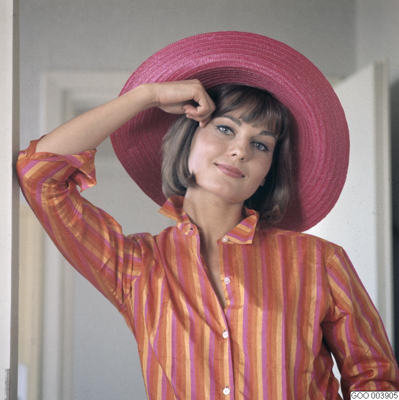 LAVINIA. Modell klädd i långärmad randig blus i rött, orange, rosa och gult. Rosa stråhatt på huvudet. Modebild såld via bildbyrån "Tio Fotografer"