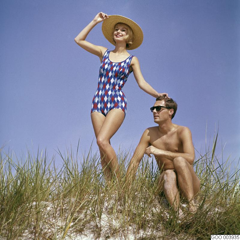 LAVINIA. Modell klädd i rutig baddräkt i vitt, rött och olika blå nyanser. Stråhatt på huvudet. Modebild såld via bildbyrån "Tio Fotografer"