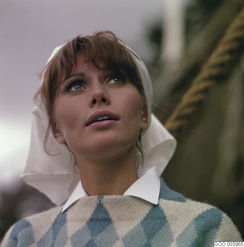 LAVINIA. Modell klädd i beige tröja med med rutmönster i blå nyanser. Vit sjalett på huvudet. Modebild såld via bildbyrån "Tio Fotografer"