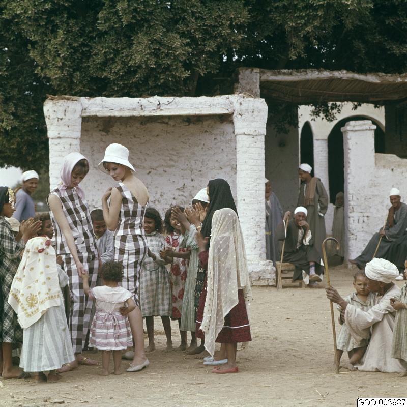 LAVINIA. Modeller klädda i rutiga dräkter i brunt och vitt båda har ärmlösa toppar. Den ena med byxor den andra med kjol. Rosa sjal och vit hatt. Modebild såld via bildbyrån "Tio Fotografer"