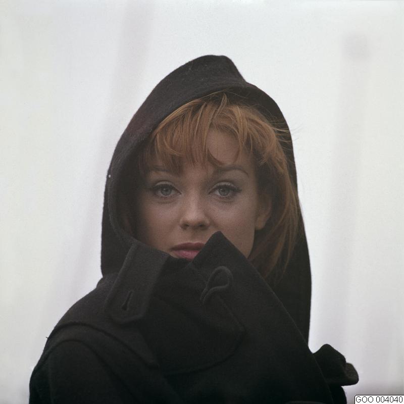 Modell klädd i svart duffel med kapuschong. Modebild såld via bildbyrån "Tio Fotografer"