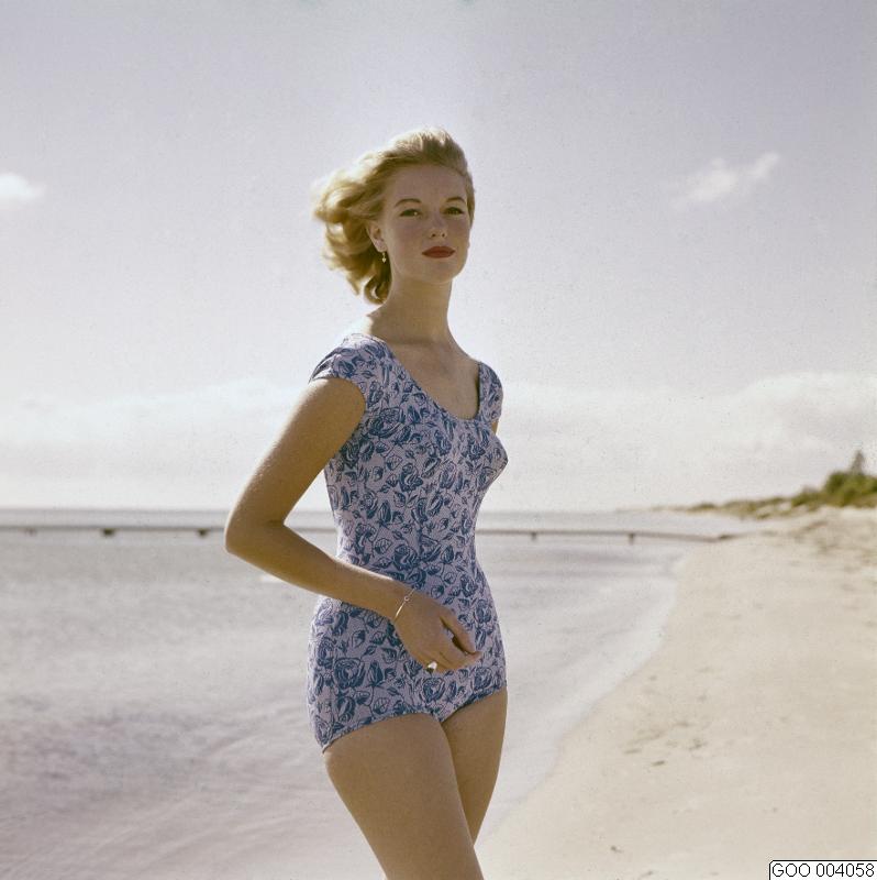 LAVINIA. Modell klädd i vit baddräkt med blommönster i blått. Modebild såld via bildbyrån "Tio Fotografer"