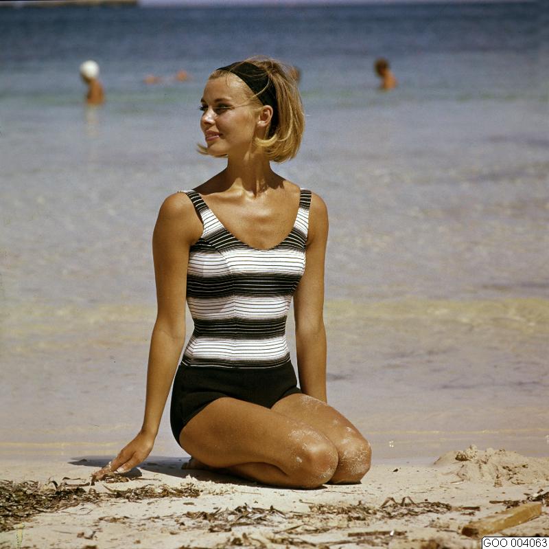 LAVINIA. Modell klädd i svart baddräkt med randig överdel i svart, vitt och beige. Svart hårband. Modebild såld via bildbyrån "Tio Fotografer"