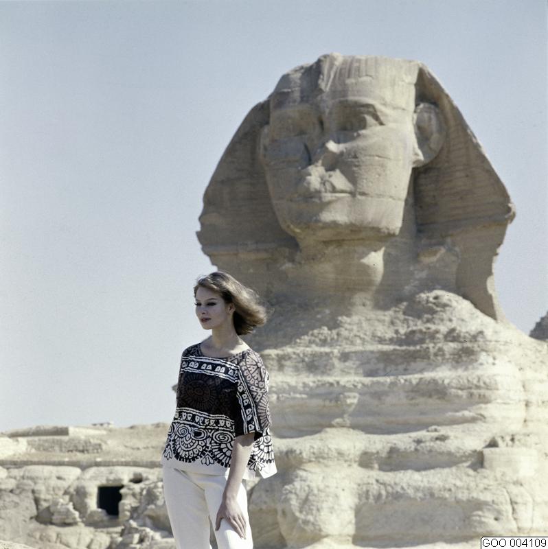 LAVINIA. Modell klädd i vita byxor och mönstrad tunika i vitt, svart och brunt. Modebild såld via bildbyrån "Tio Fotografer"