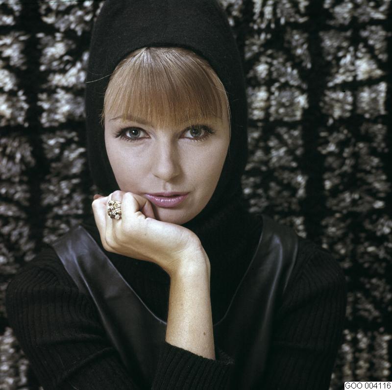 Modell klädd i svart huvtröja och västklänning i svart skinn. Modebild såld via bildbyrån "Tio Fotografer"