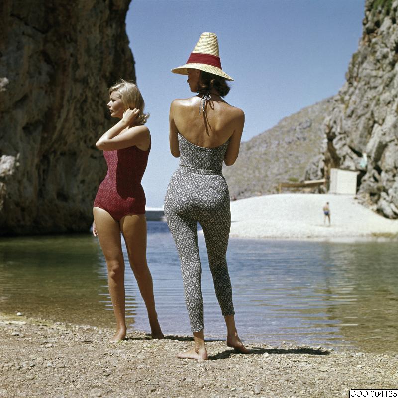 LAVINIA. Modeller klädda i mönstrad baddräkt i rött, gult och lila samt mönstrad baddräkt och tights i vitt och grått. Stråhatt med rött band. Modebilder sålda via bildbyrån "Tio Fotografer"