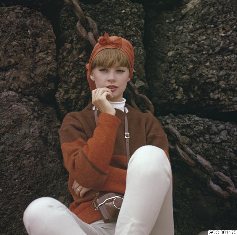 Modell klädd i vita byxor, brun- och rostbrun samt terrakottafärgad tröja med terrakottafärgad sjalett på huvudet. Modebild såld via bildbyrån "Tio Fotografer"