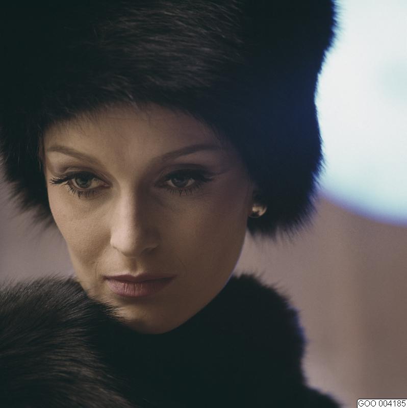 Modell klädd i svart päls och pälsmössa, rosa läppstift, eyeliner, mascara, ögonskugga med markerad globlinje och målade ögonbryn. Modebild såld via bildbyrån "Tio Fotografer"