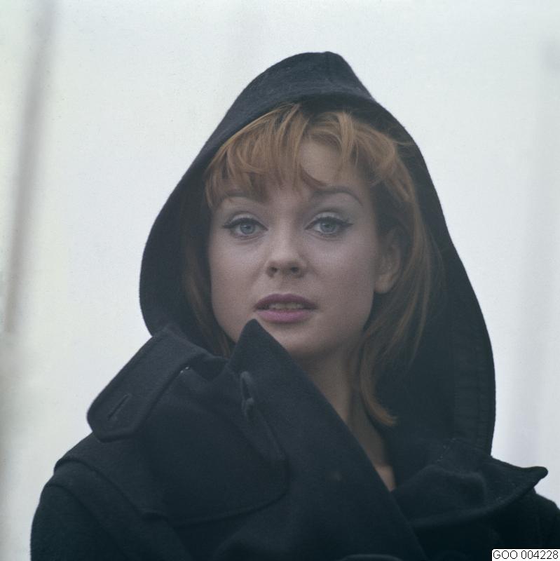 LAVINIA; Modell klädd i svart duffeljacka- eller kappa med huva. Modebild såld via bildbyrån "Tio Fotografer"