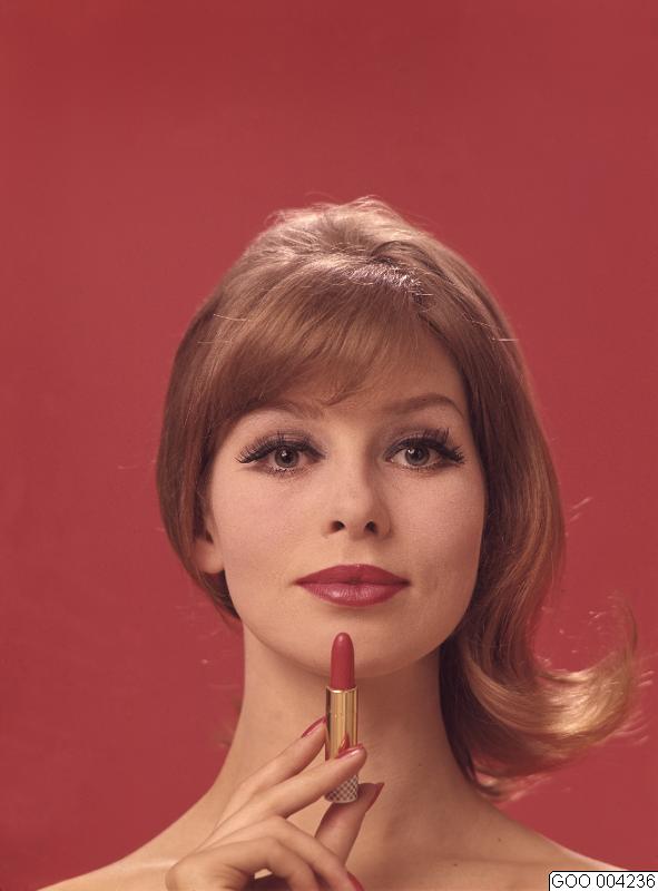 LAVINIA. Modell med cerisefärgat läppstift i handen och på läpparna, eyeliner, mascara, ögonskugga med markerad globlinje och målade ögonbryn. Modebild såld via bildbyrån "Tio Fotografer"
