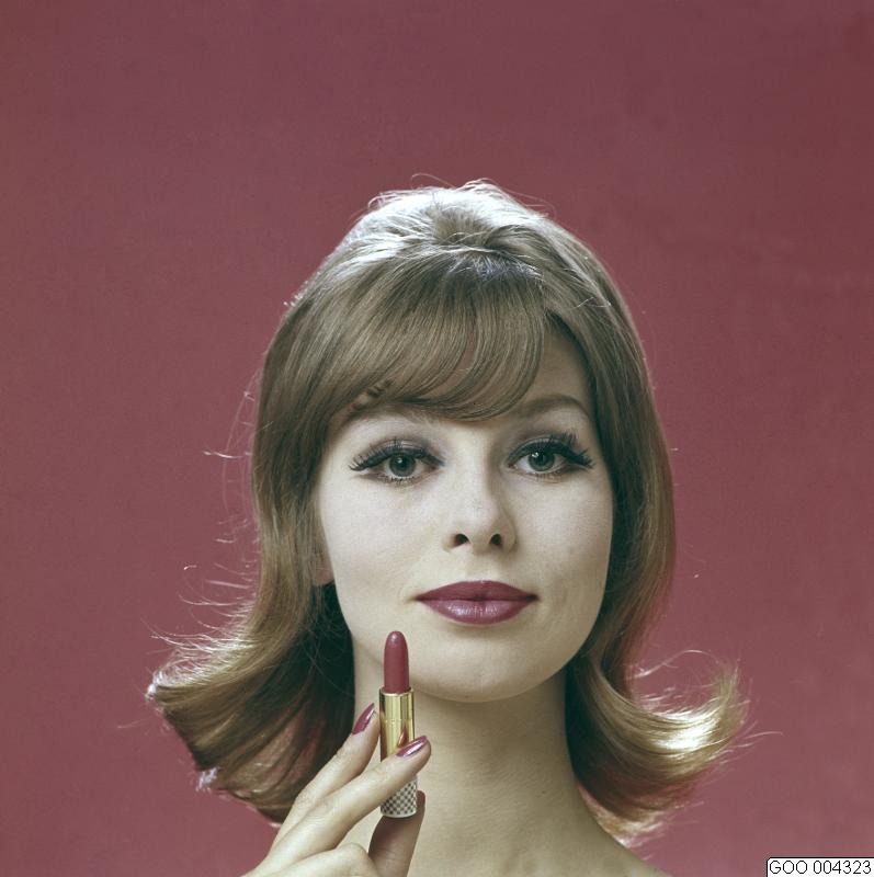 LAVINIA. Modell med cerisefärgat läppstift i handen och på läpparna, eyeliner, mascara, ögonskugga med markerad globlinje och målade ögonbryn. Modebild såld via bildbyrån "Tio Fotografer"