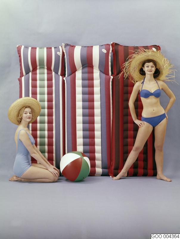 LAVINIA. Modeller klädda i ljusblå baddräkt och kornblå bikini. Stråhatt. Modebilder sålda via bildbyrån "Tio Fotografer"