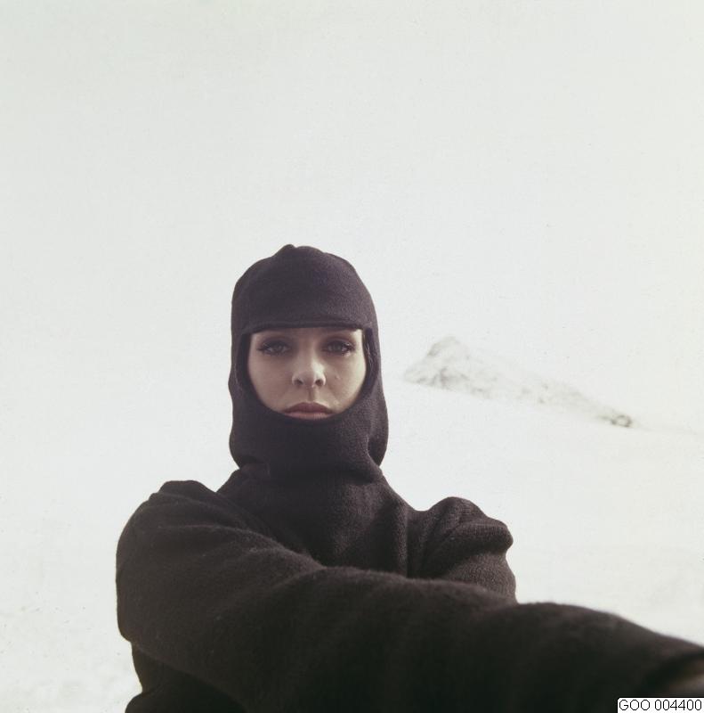 LAVINIA. Modell klädd i svart stickad långärmad tröja med huva som är försedd med skärm. Modebild såld via bildbyrån "Tio Fotografer"