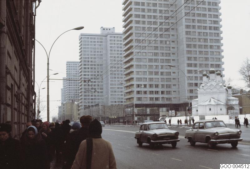 Moskva, höghus/bostadshus och ortodox kyrka vid trafikerad gata.