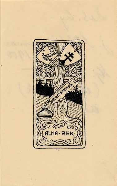 - Olof Per Hjalmar Ekerots exlibris. Motivet är ett stiliserat träd med granskog bakom. I trädet topp finns två vapensköldar, till vänster för den adliga ätten Rothliebs (Ekeroths släkt på mödernet) och till höger ungerska riksvapnet (Ekeroths släkt på fädernet). Vid trädets rot finns ett bläckhorn med en gåspenna. Nederst namnet Alma Rek, en av Ekeroths pseudonymer. Källa: Bibliotek och Exlibris av C. M. Carlander.
