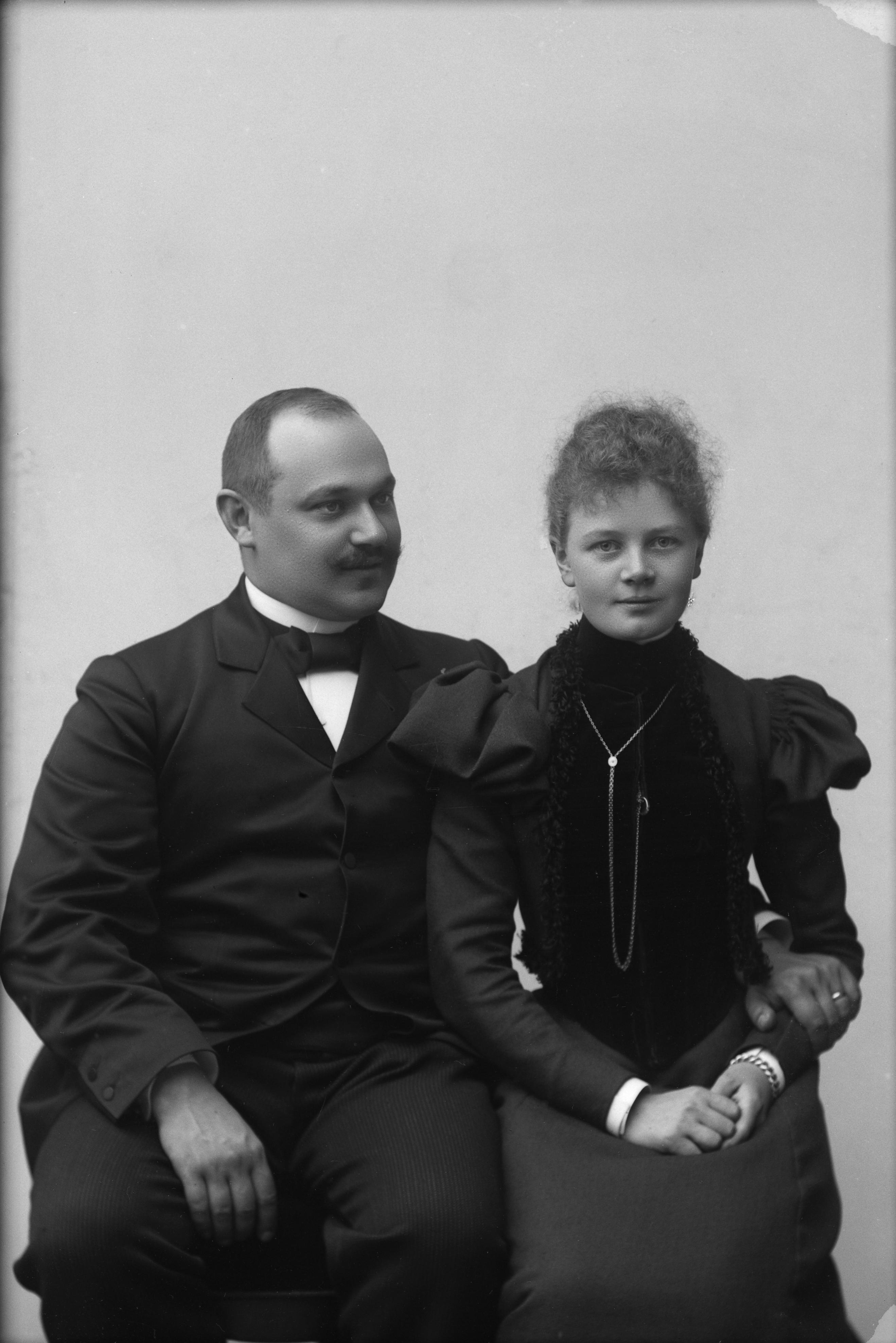 Porträtt i helfigur av E. Sundström vid Malmö Mekaniska Trikåfabrik, med fru.