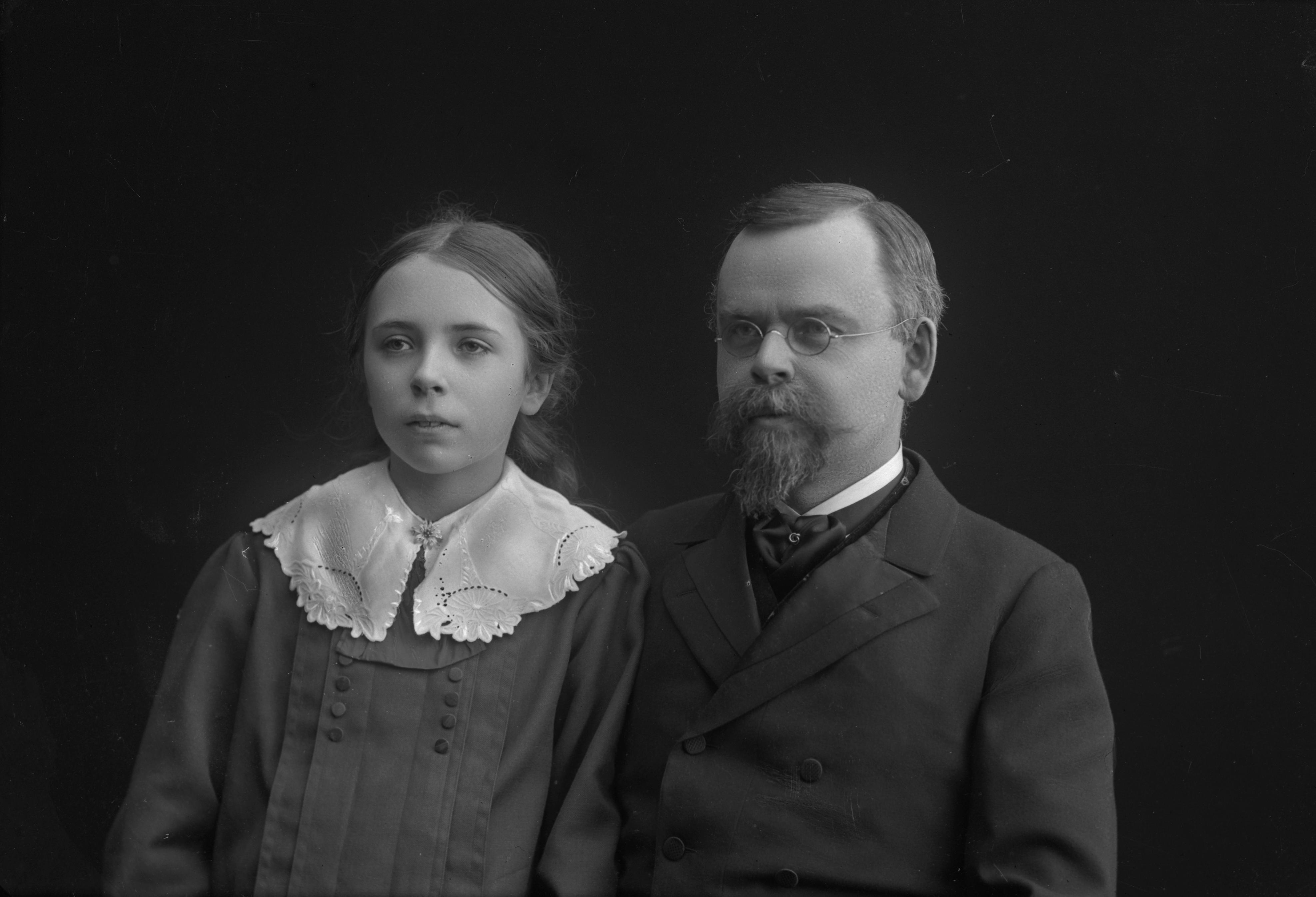 Porträtt i halvfigur av kyrkoherde Jonas Henrik Hallenberg med dotten Karin.