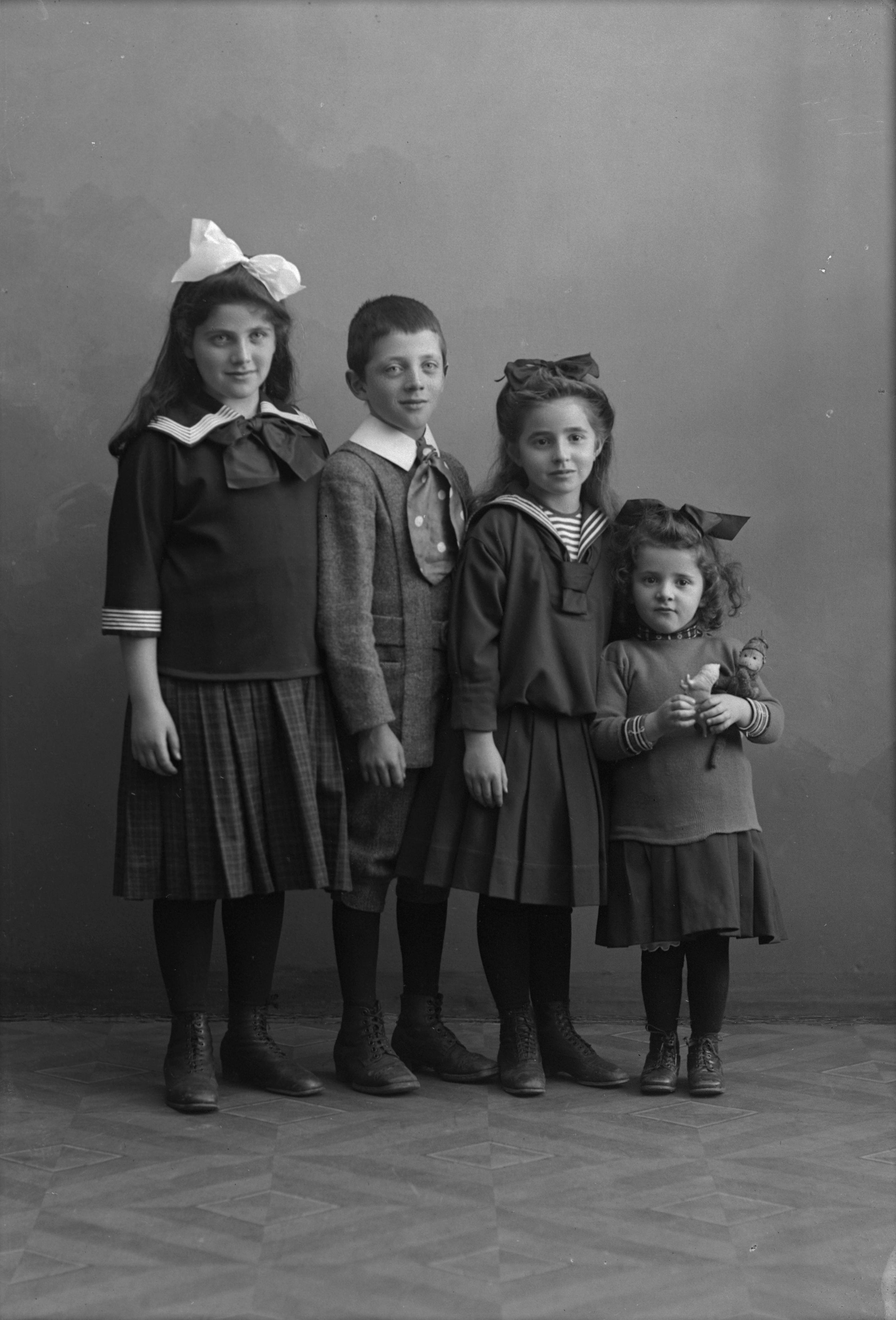 - Porträtt i helfigur av Inez, Knute och Lisa Schanzer, tillsammans med kusinen Inga Levin. Flickorna med stora rosetter och iklädda sjömanskostym. Lisa Schanzer hållande docka och leksakskatt.