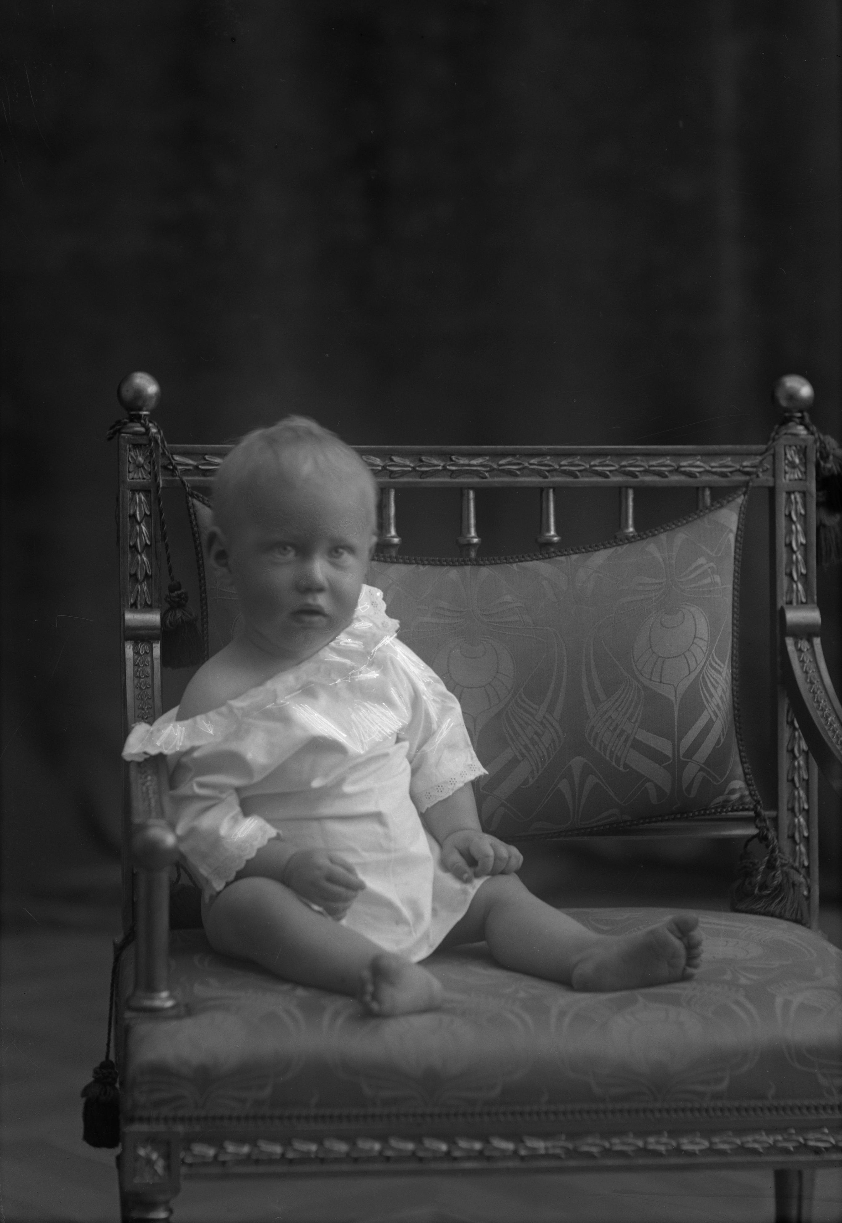 Porträtt i helfigur av fru Ahlins son, sittande i stol.