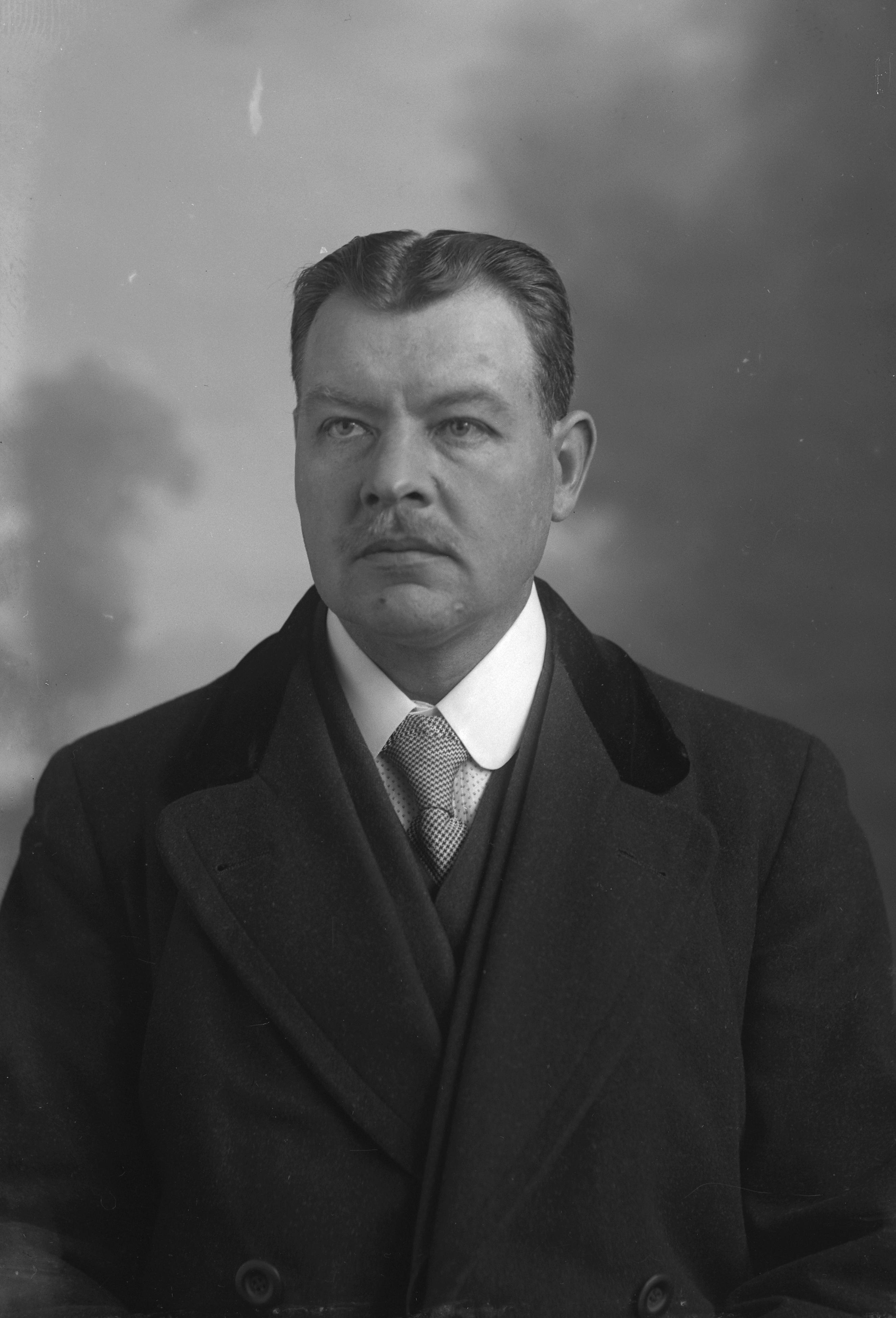 Porträtt i halvfigur av lokförare Karl Edvard Almquist.