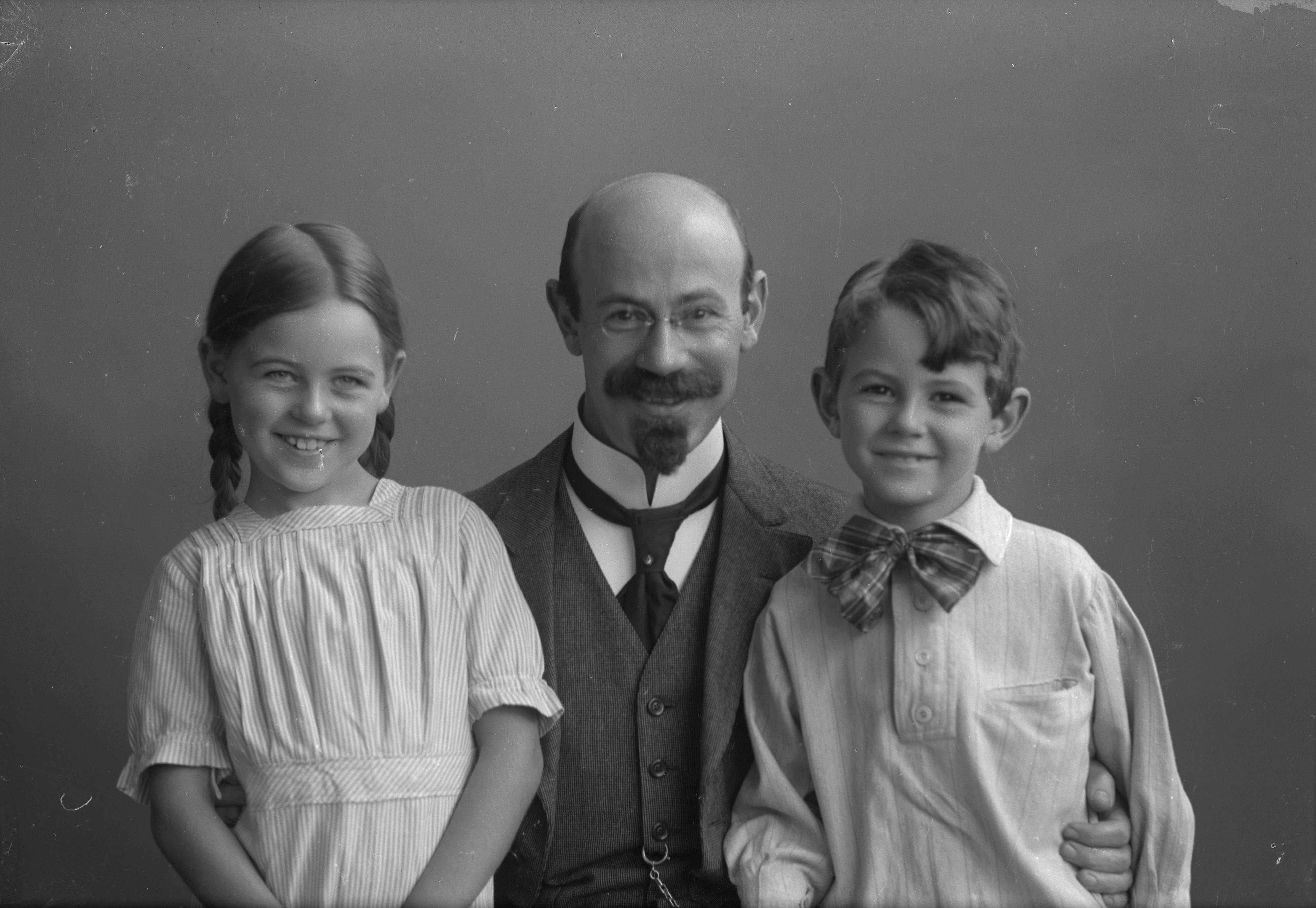Porträtt i halvfigur av disponent Israel Goldschmidt med sina barn Mina Margareta och Hans Adam.
