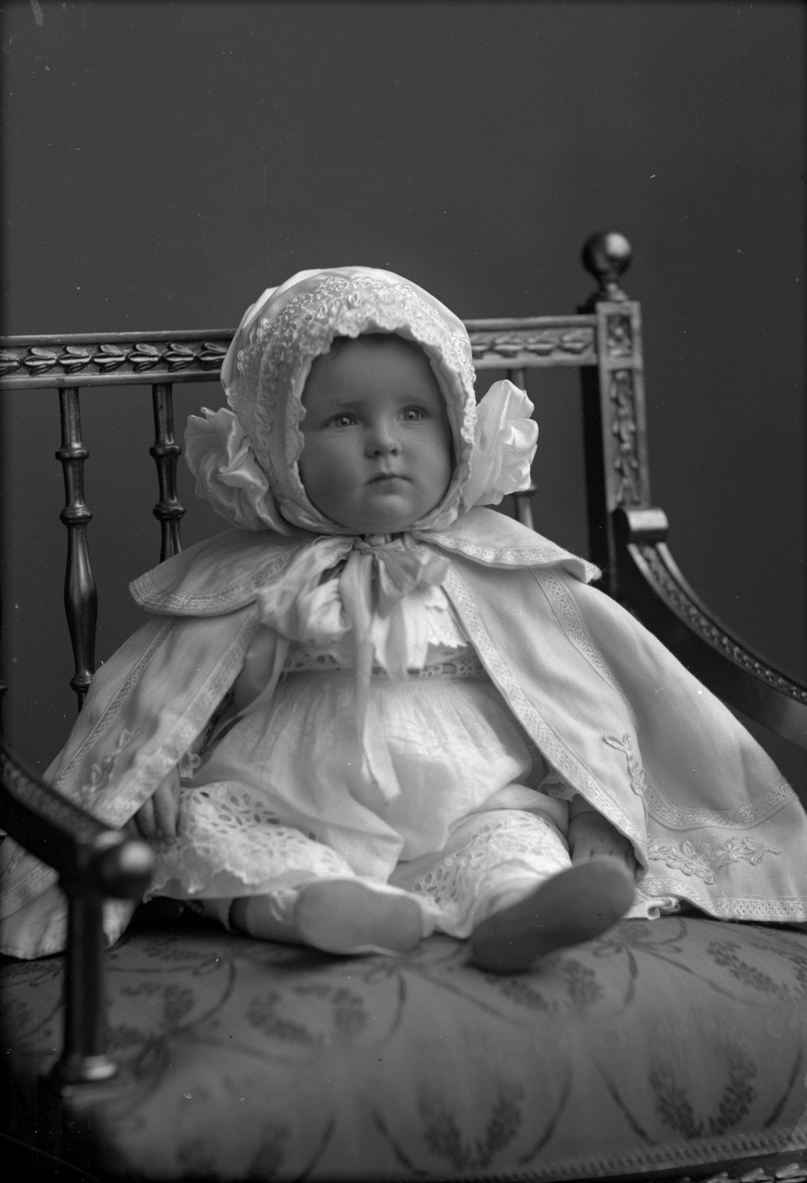 Porträtt i helfigur av fru Östbergs dotter, sittande på stol.