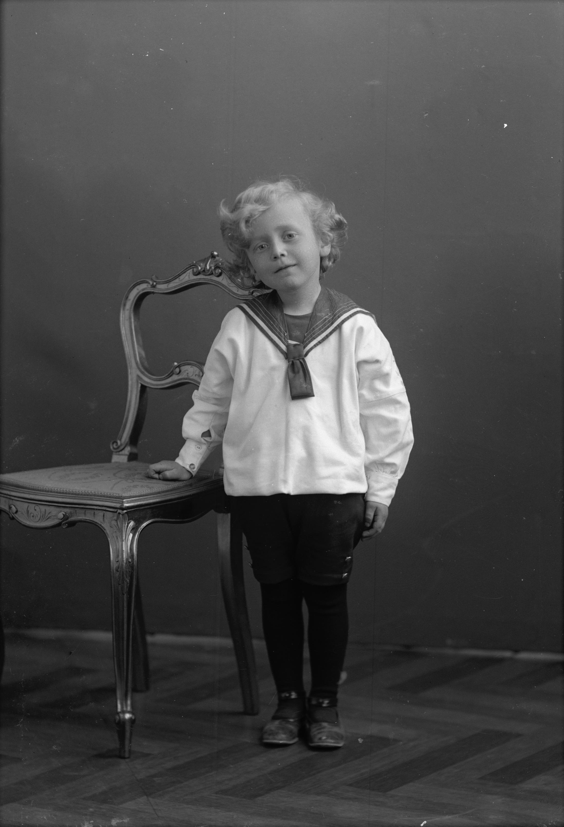 Porträtt i helfigur av Lennart Uppenberg, iklädd sjömanskostym, stående vid stol.