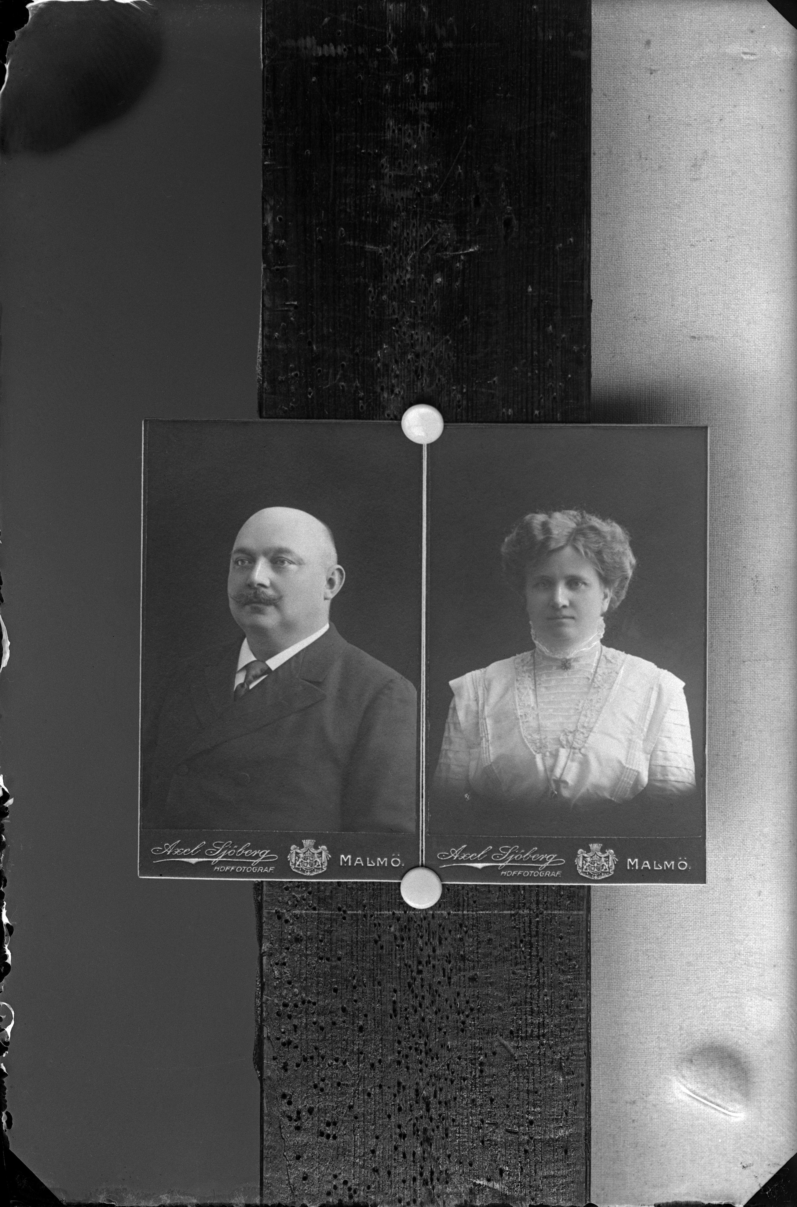 Två porträtt i halvfigur: grosshandlare Wilhelm Lindgren och fru Lindgren. Två visitkort med ateljélogotyp, "Axel Sjöberg /Hoffotograf /Malmö".
