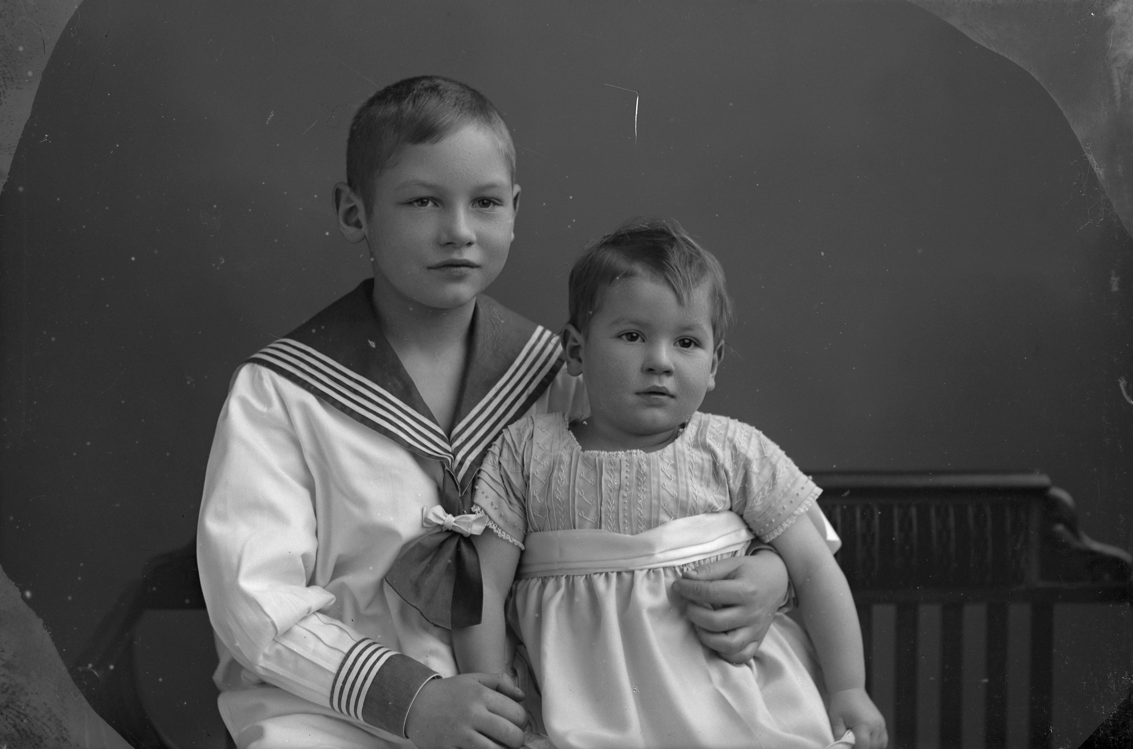 Porträtt i halvfigur av fru Ohlssons son och dotter, sittande tillsammans på soffa. Sonen iklädd sjömanskostym.