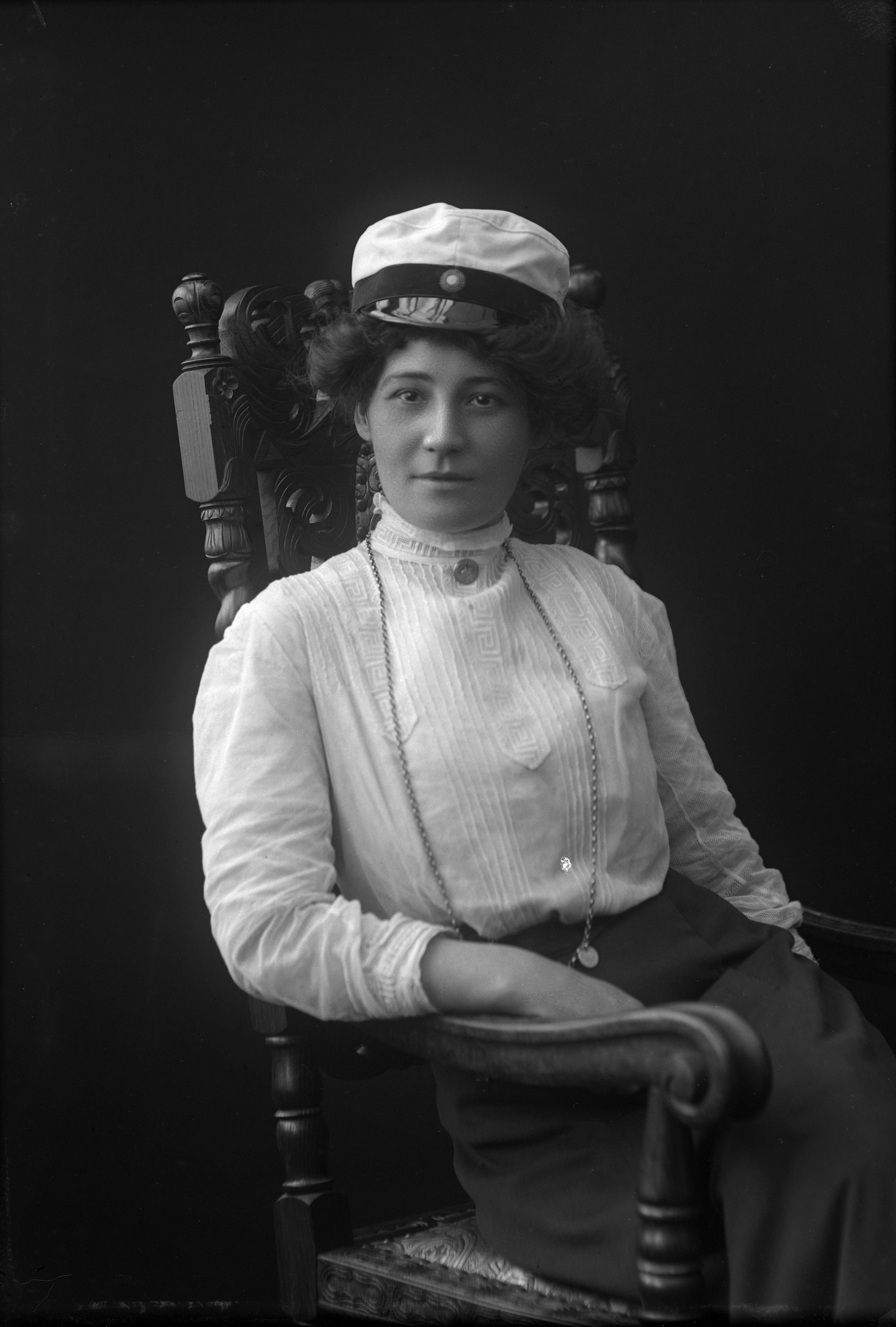 Porträtt i helfigur av H. Ekberg i studentmössa, sittande i karmstol.