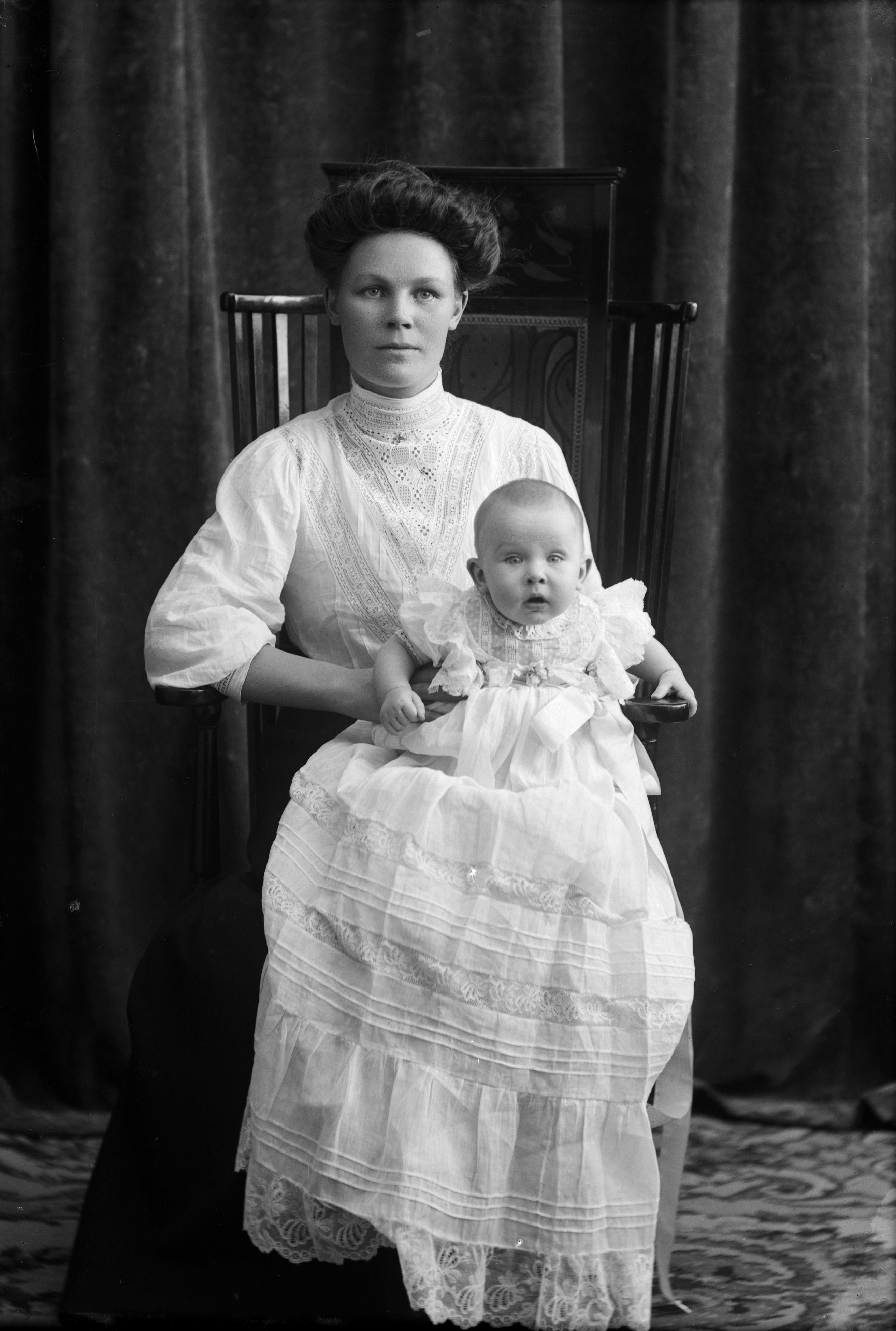 Porträtt i helfigur av Ebba Abertina Wagner, hållande dottern Ruth i famnen. Dottern bär dopklänning.