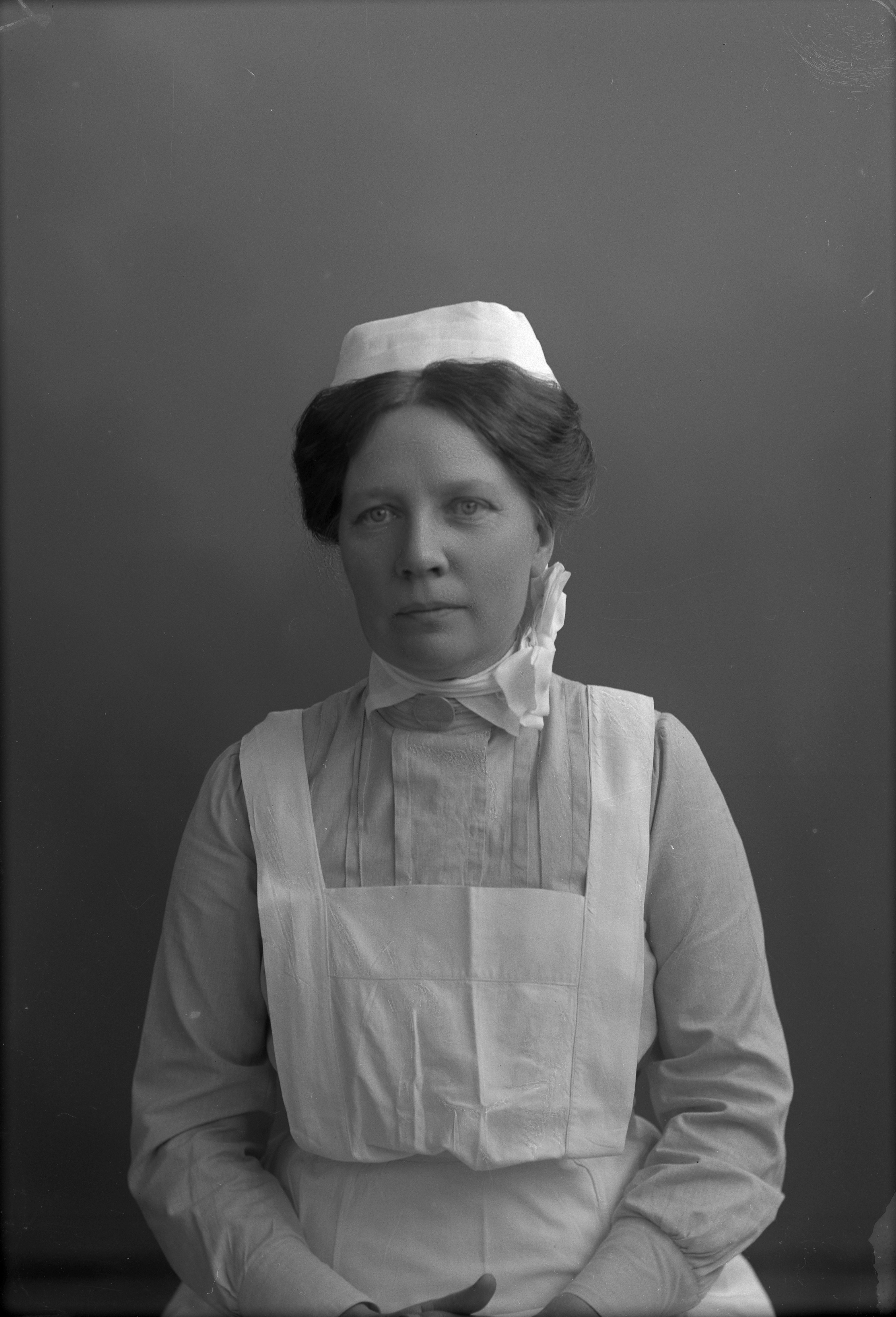 Porträtt i halvfigur av Nanny Carlsson, iklädd sjuksköterskeuniform.