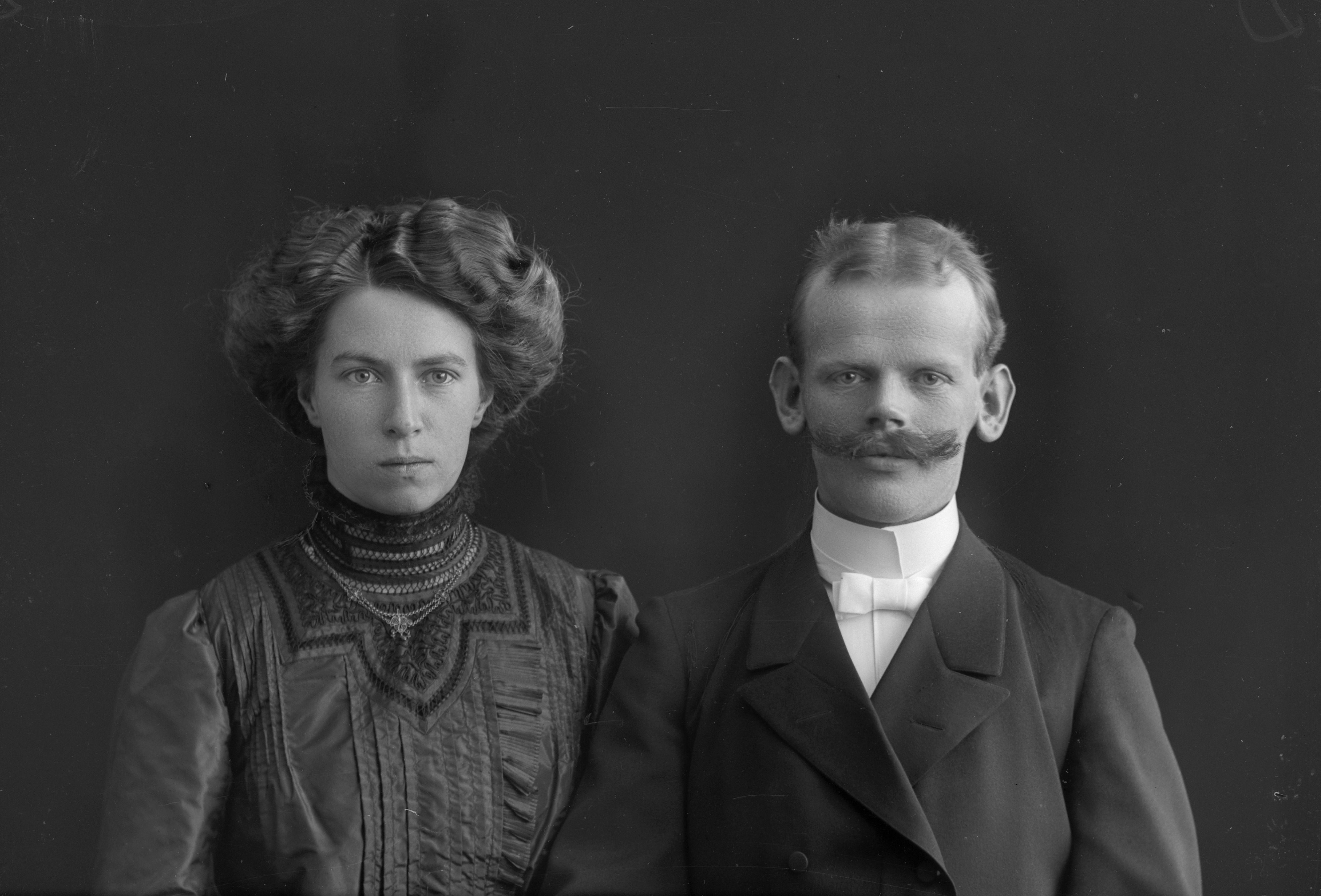 Porträtt i halvfigur av folkskollärare Erik Pamp med frun Jenny Cronqvist. Fotograferade dagen efter sitt bröllop.