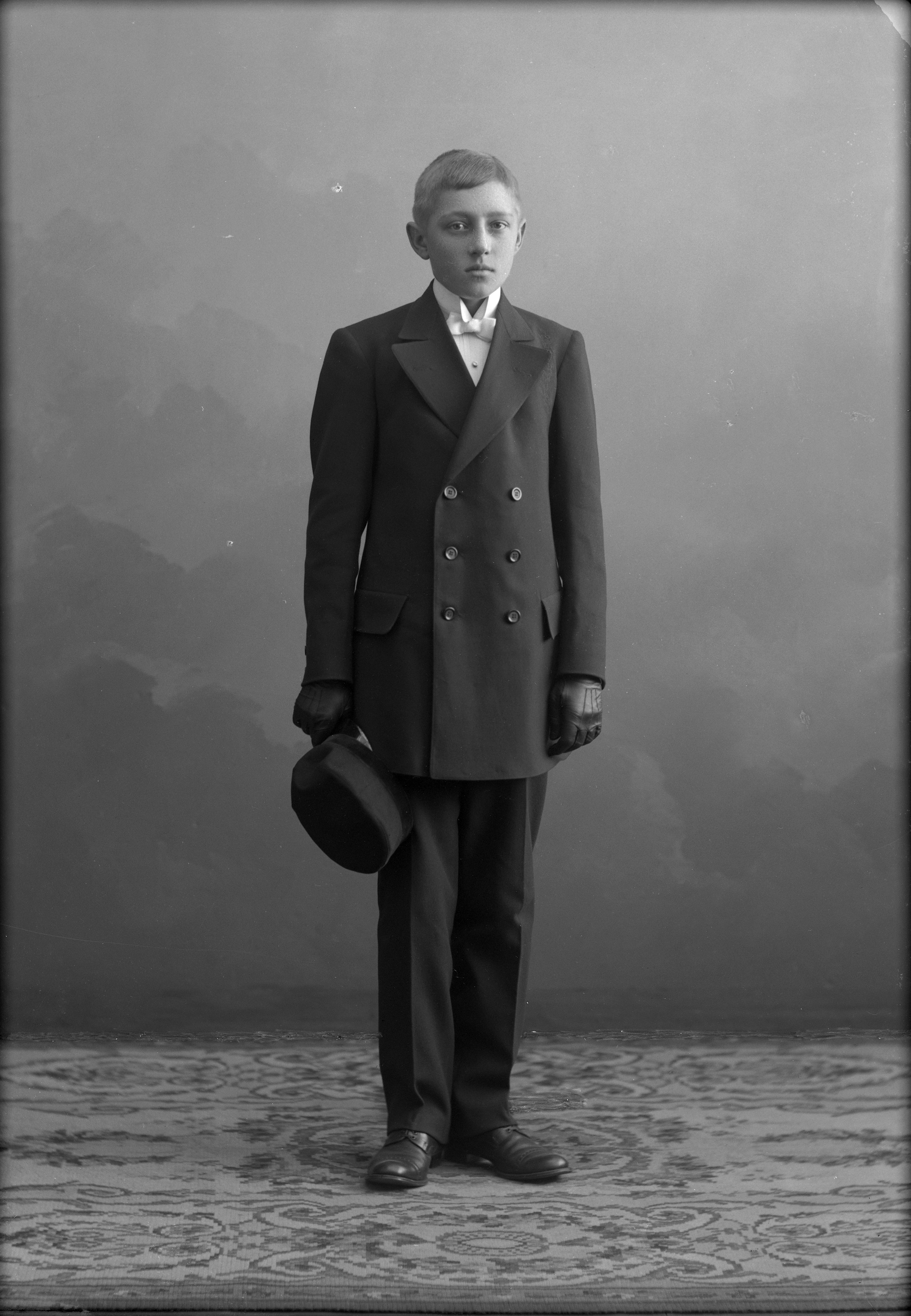Porträtt i helfigur av konfirmanden E. Jörgensen, iklädd kavaj och handskar, hållande skärmmössa.