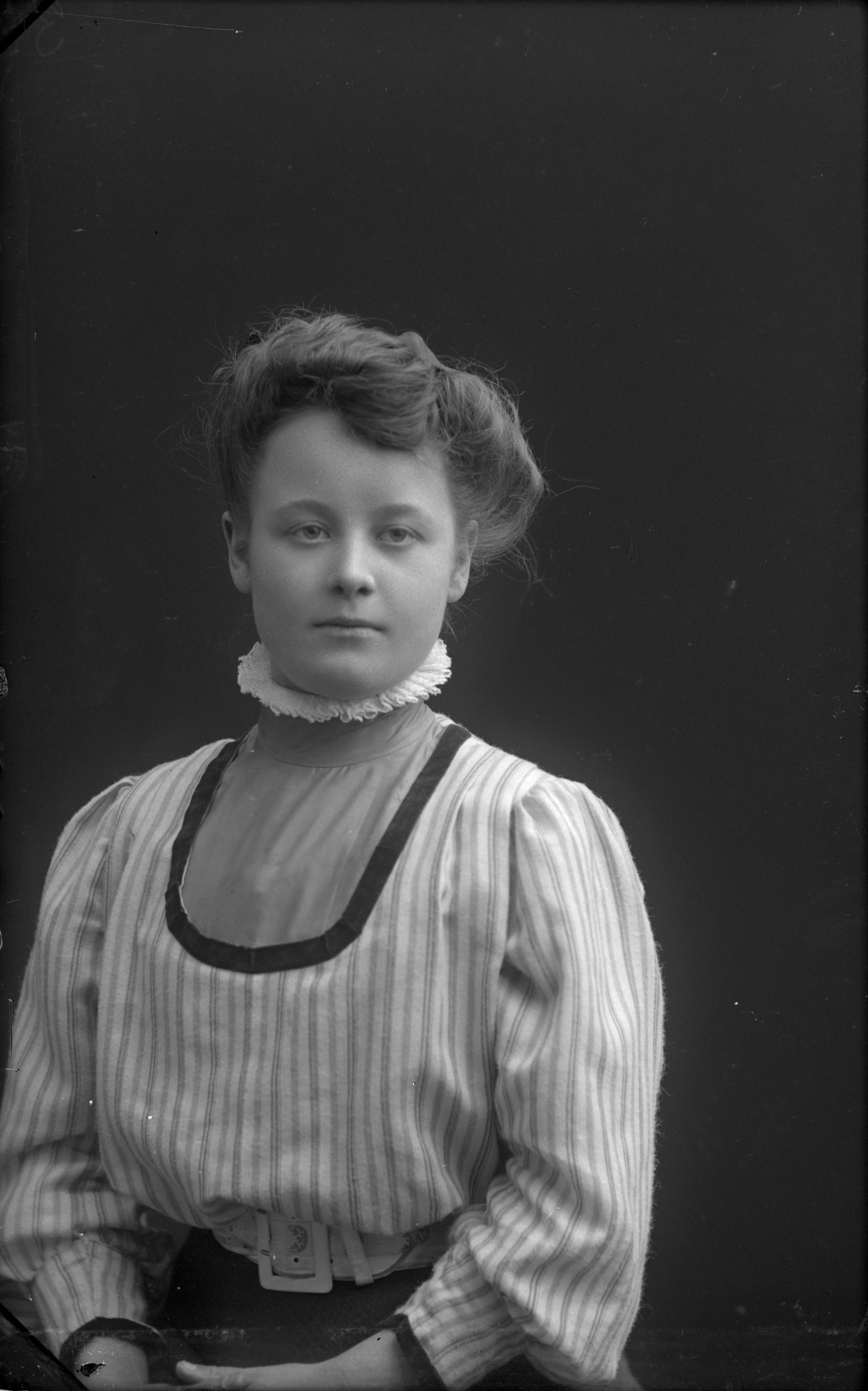 Porträtt i halvfigur av buktiksbiträdet Esther Persson.