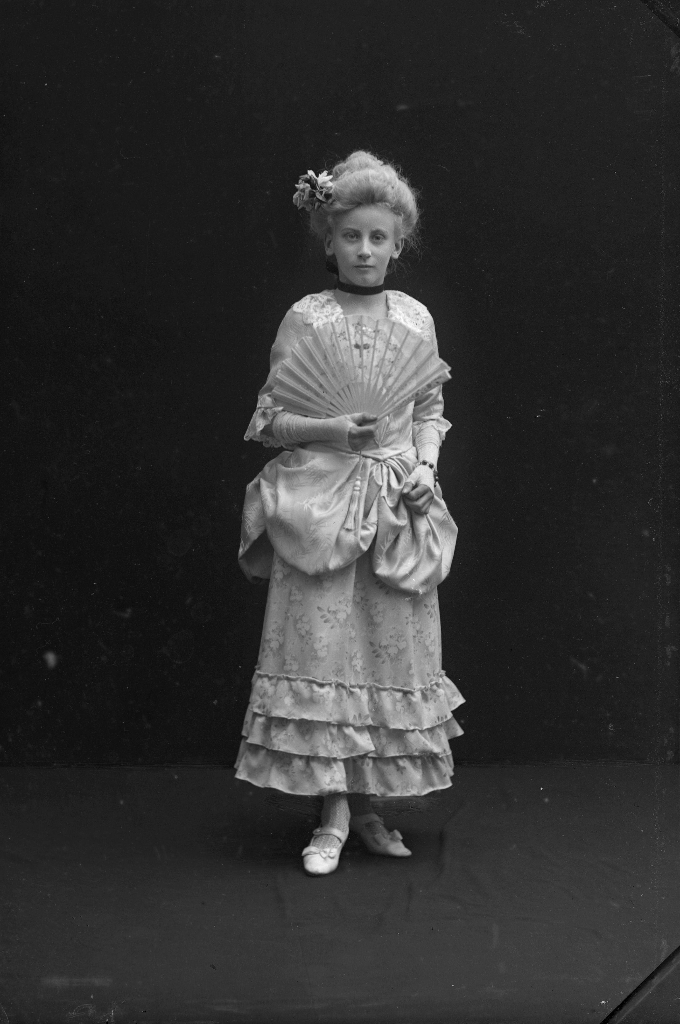 Porträtt i helfigur av Elsa Berg, hållande solfjäder.