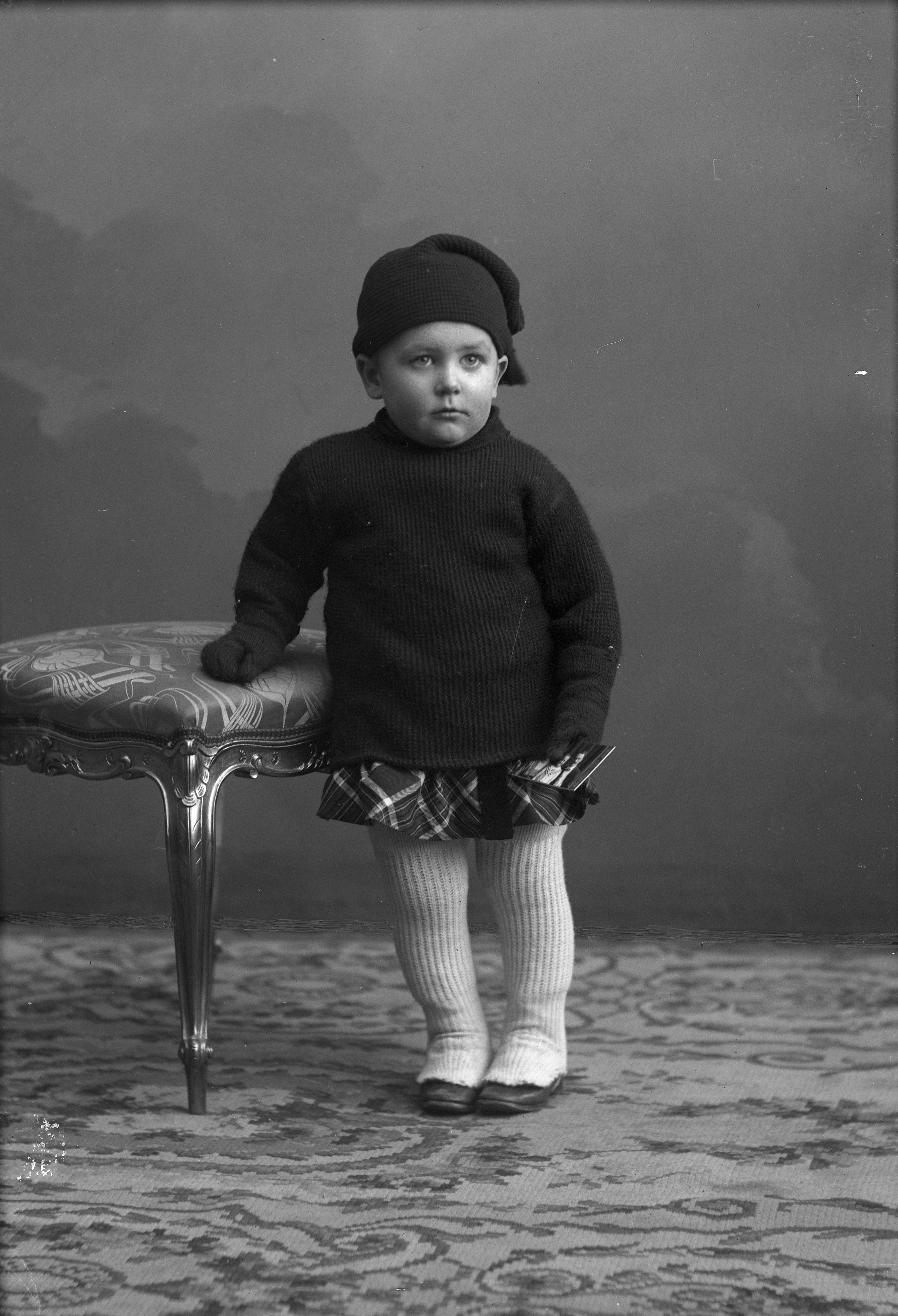 Porträtt i helfigur av fru Magnussons son, iklädd stickad tröja och mössa, stående vid kullerstol, hållande fotografi.