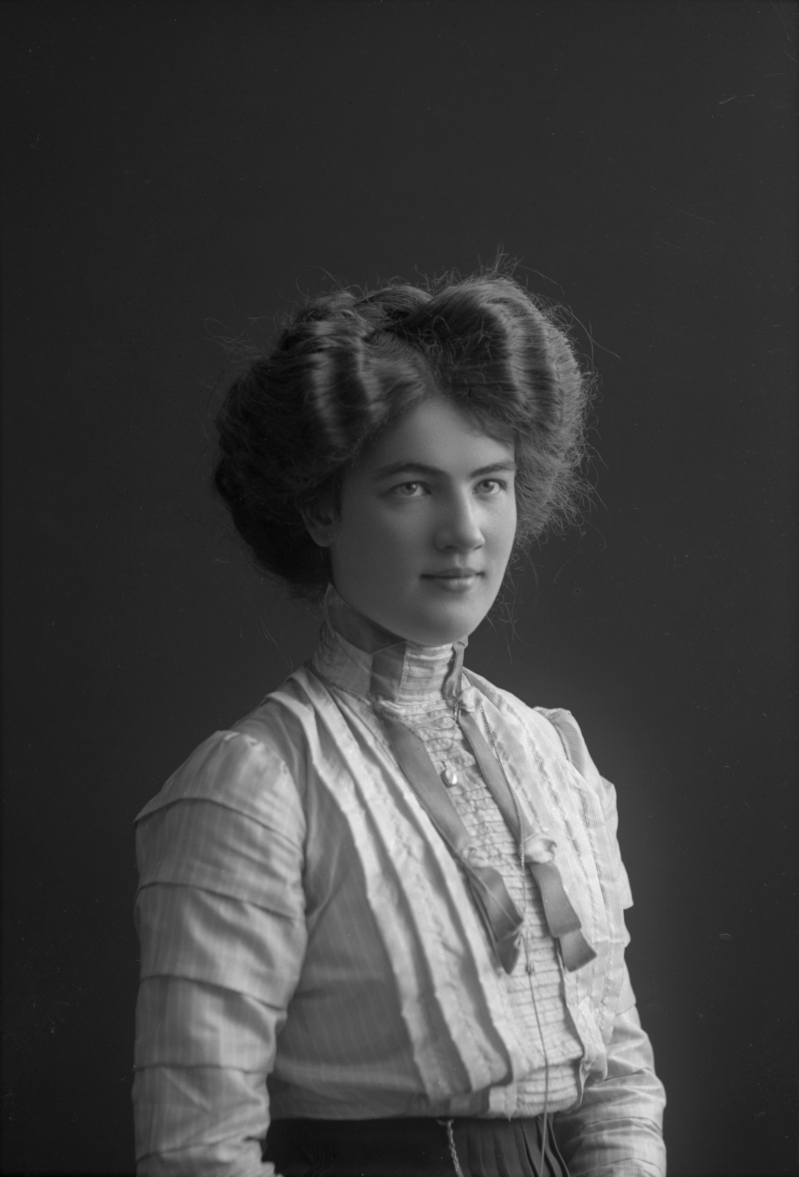 Porträtt i halvfigur av fröken Theorin vid Sydsvenska Dagbladet.