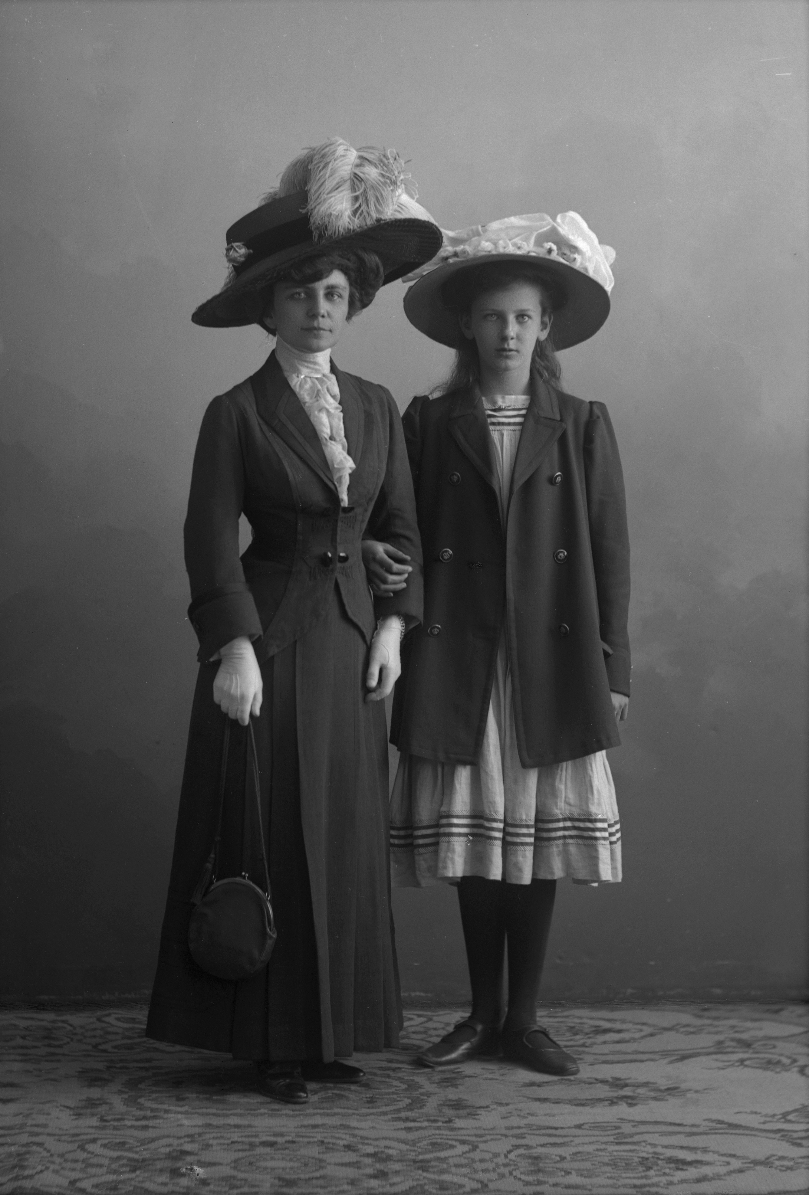 Porträtt i helfigur av fru Rüder med dotter, båda iklädda stora hattar, moderns med fjäderplym, och kappor. Modern även iklädd handskar och håller handväska.