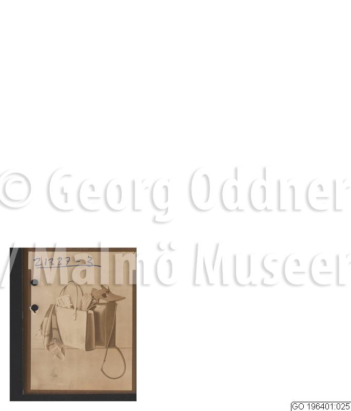 Handväska, handskar, skodon, tidning, sjal.