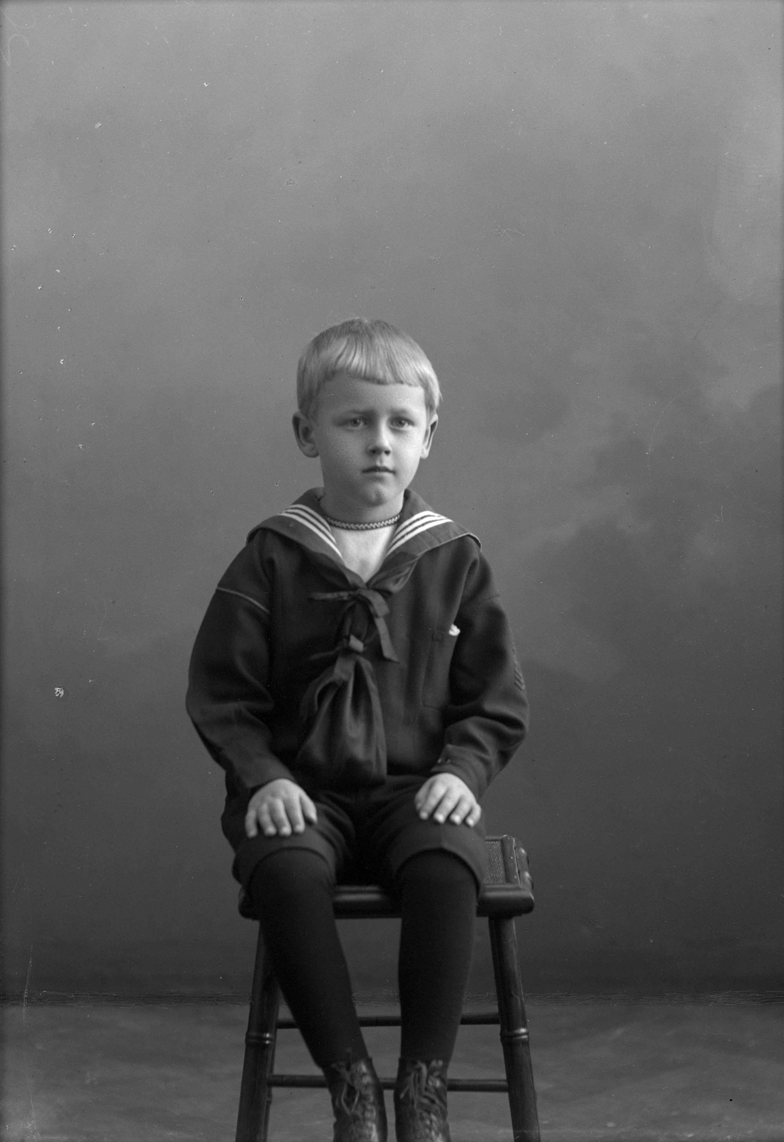Porträtt i helfigur av Johan Fredrik Edvard von Seth, iklädd sjömanskostym, sittande på pall.