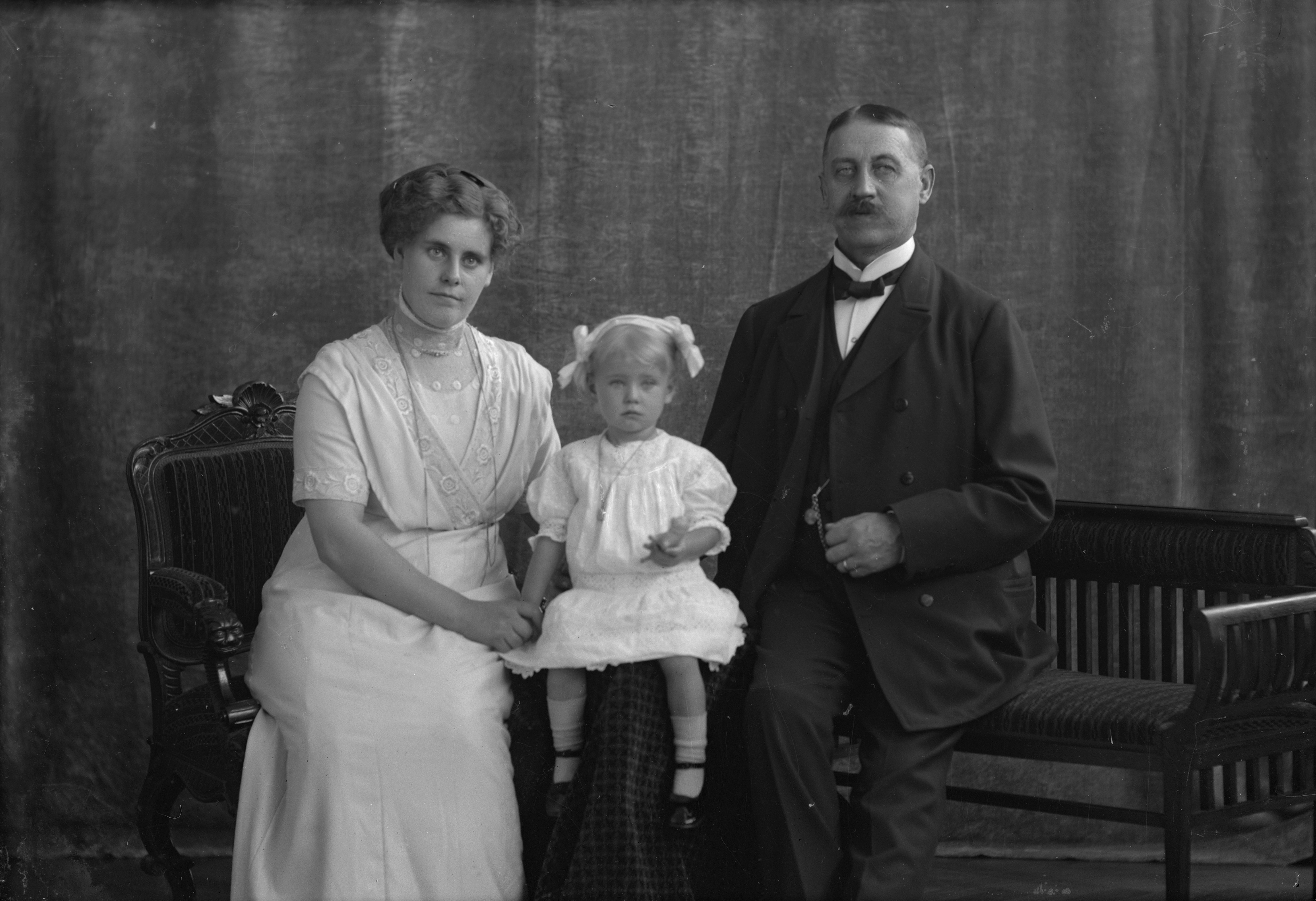 - Porträtt i helfigur av handelsman Magnus Theodor Möller med familj, frun Elisabeth Natalia och dottern Greta Elisabeth. Frun sittande i stol, fadern på soffa med dottern mellan sig. Dottern med hårband, hållande leksakskatt.