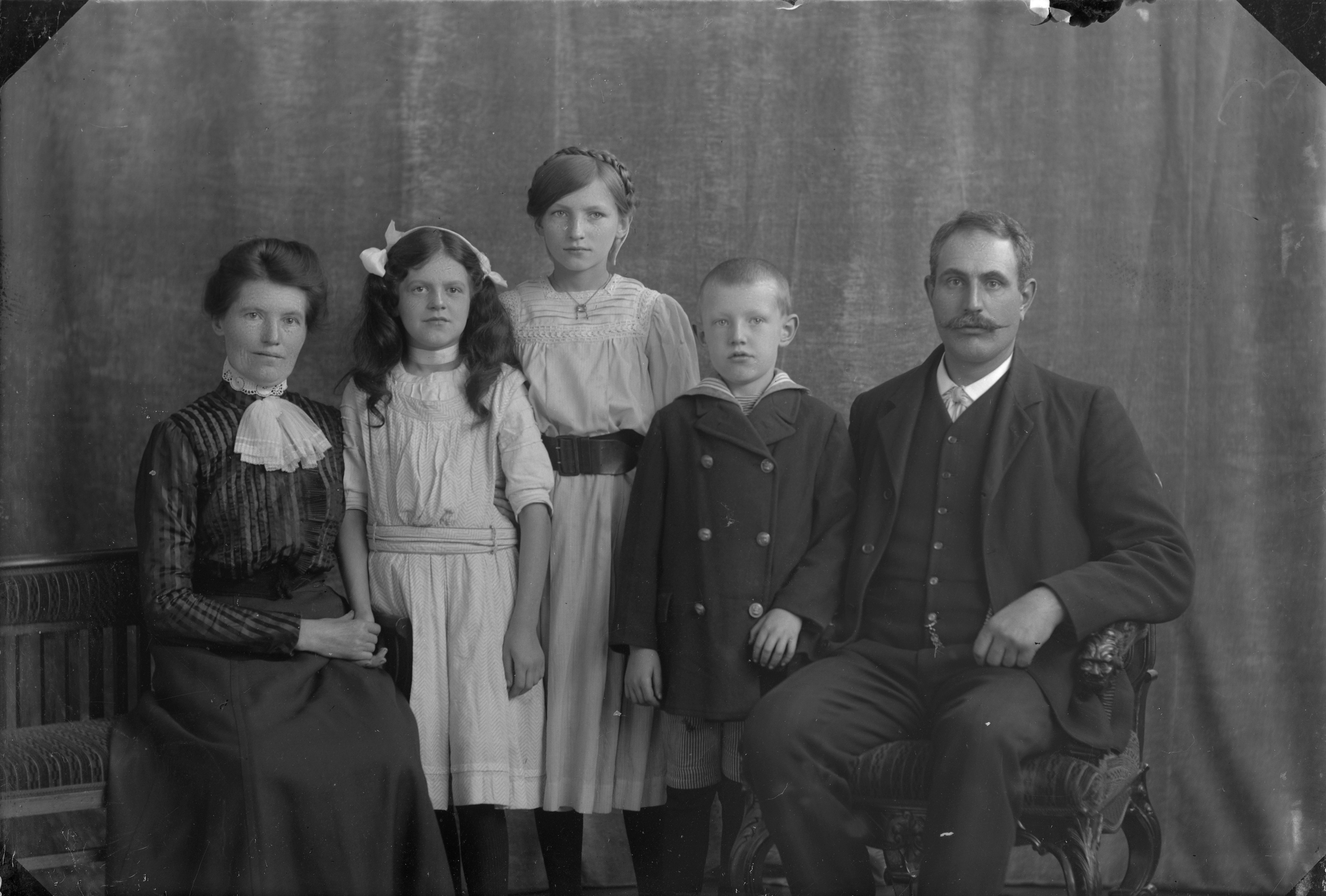 Porträtt i helfigur av C. A. Andersson med familj. Sonen iklädd sjömanskostym, ena dottern med rosett i håret.