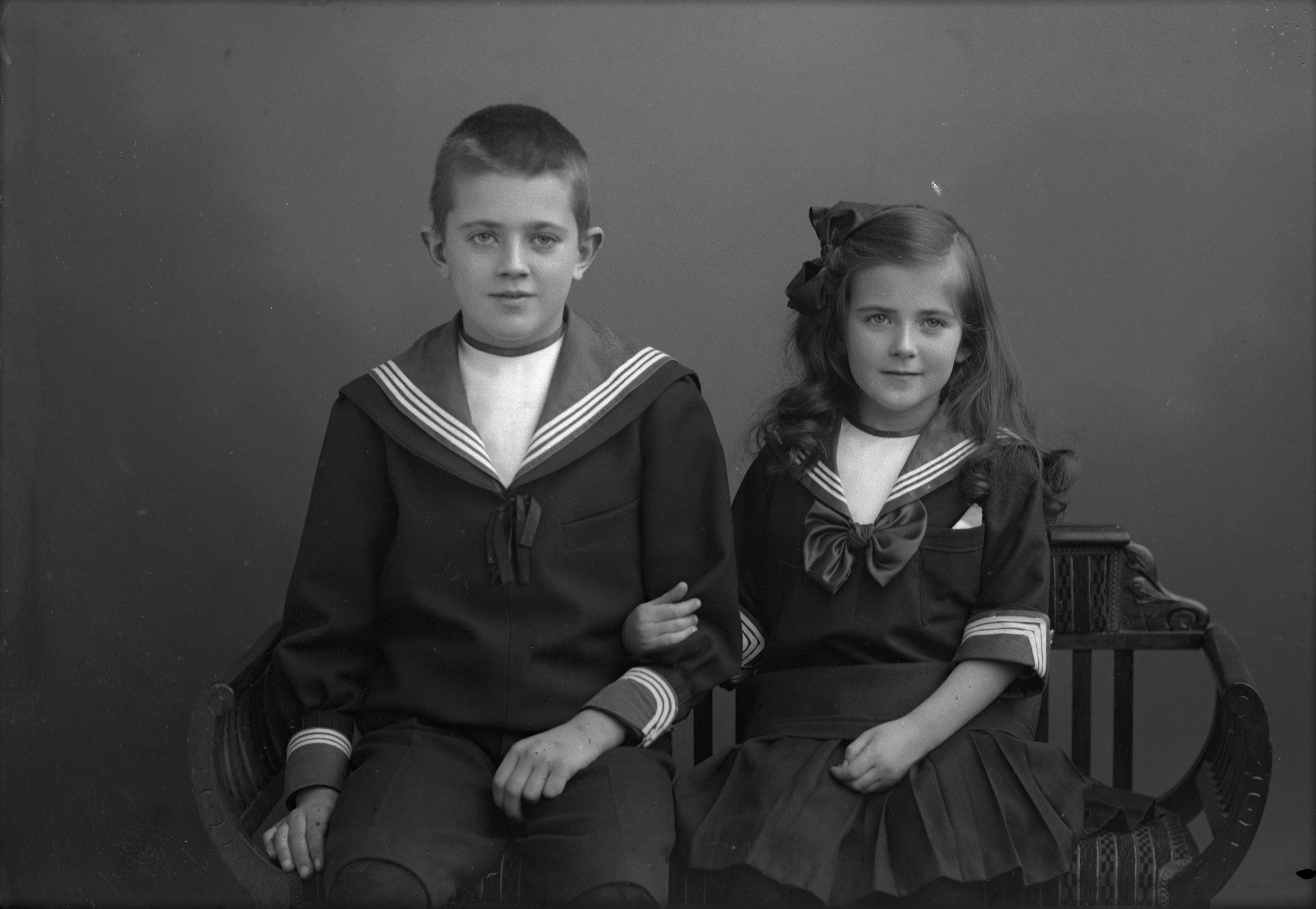 Porträtt i helfigur av Sture och Stina Lindahl, sittande tillsammans på soffa. Båda iklädda sjömanskostym, dottern med rosett i håret.