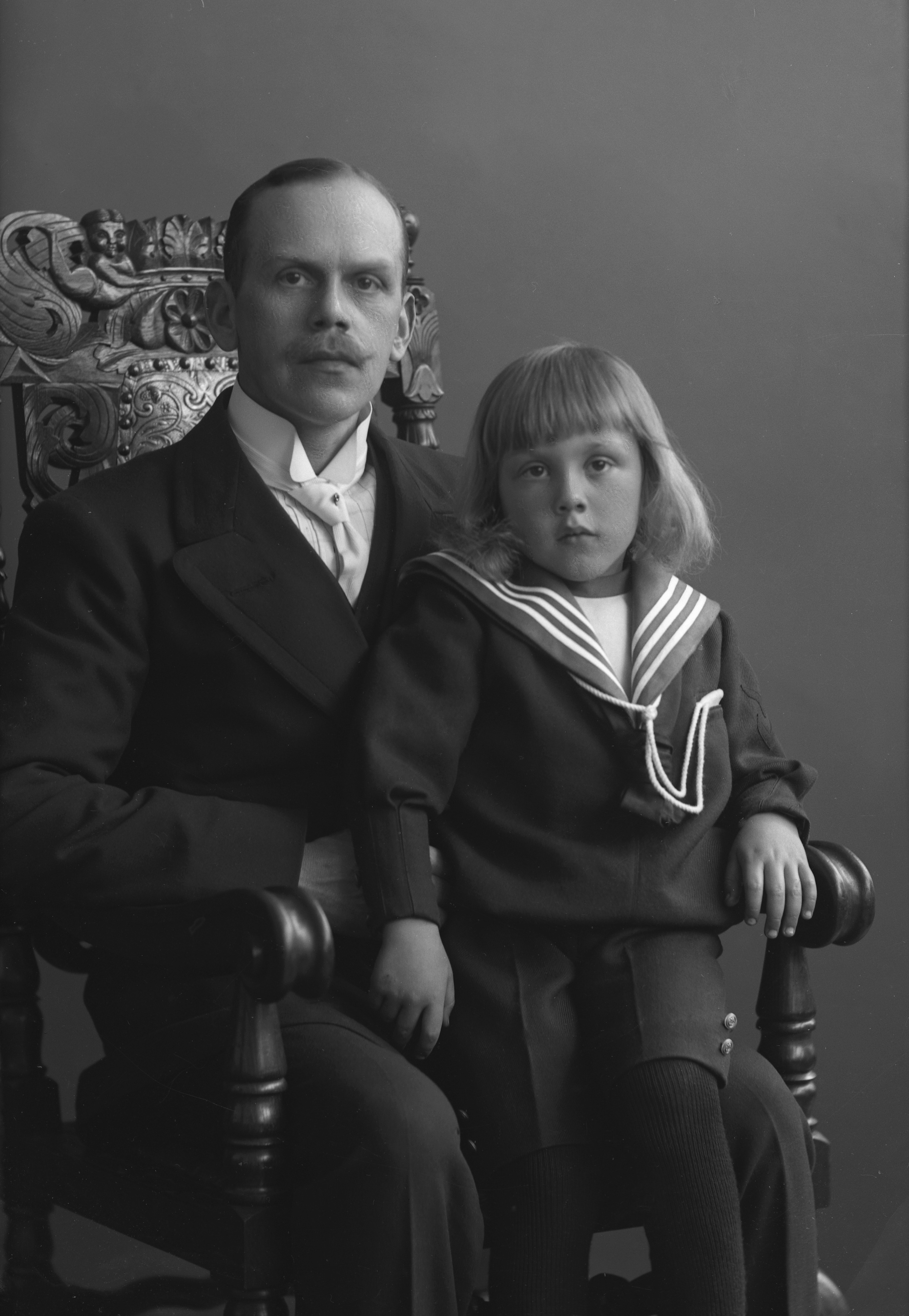 Porträtt i helfigur av Frans Persson med son. Fadern sittande i karmstol, sonen iklädd sjömanskostym.