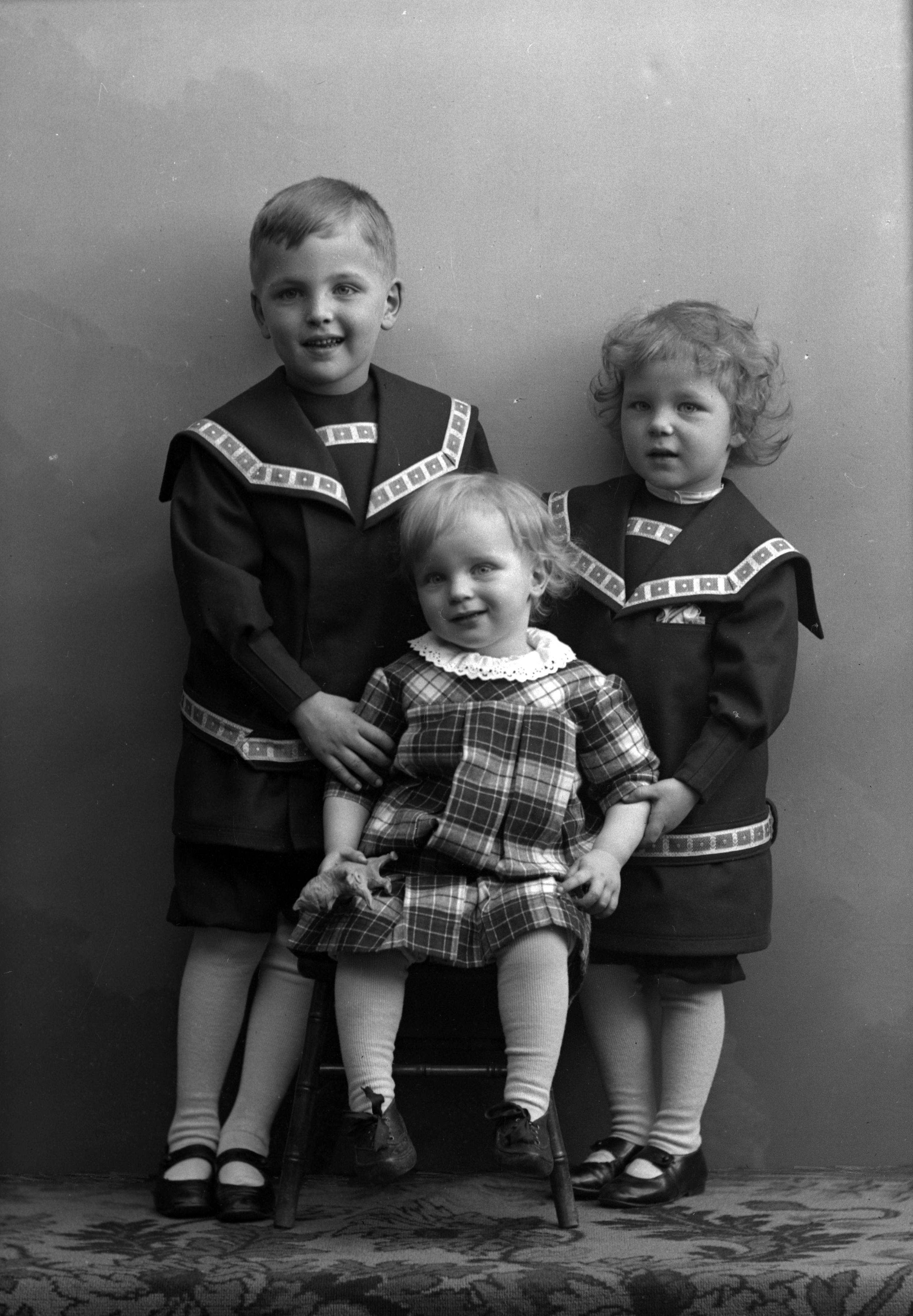 Porträtt i helfigur av Axel, Erik och Sven Nordenskjöld. Sven hållande leksakskatt, Axel och Erik iklädda sjömanskostymer.