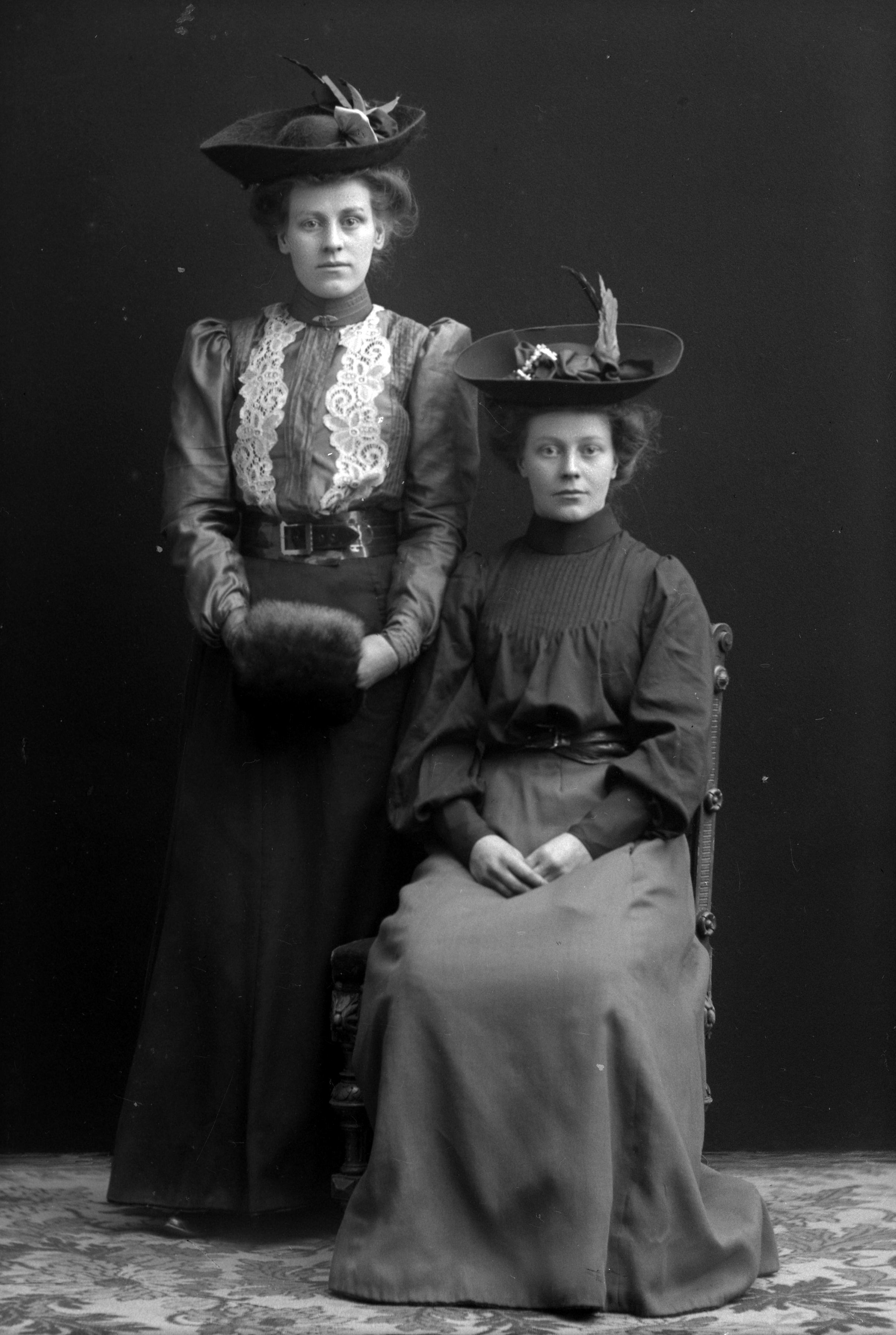Porträtt i helfigur av Jenny Magnusson vid Hovmantorps Nya Glasbruk med okänd kvinna, klädda stora hattar. Den stående kvinnan hållande handmuff i päls.