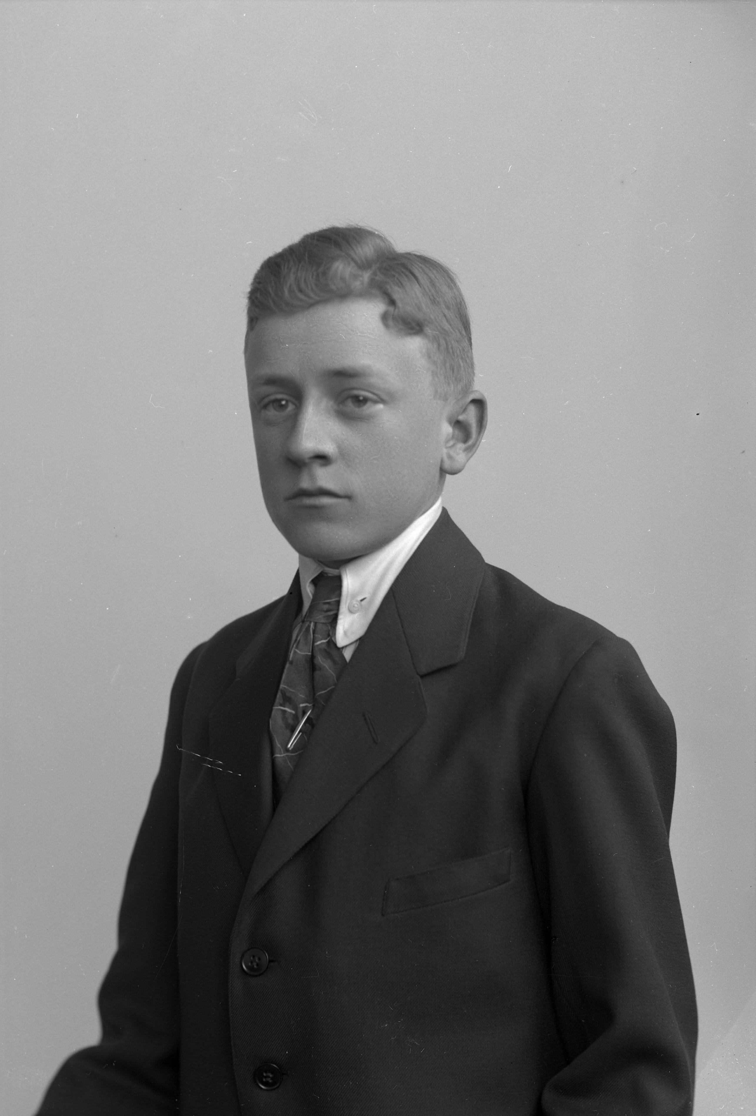Porträtt i halvfigur av Östen Herrström som konfirmand. Son till grosshandlare Sigfrid Herrström (1858-1919).