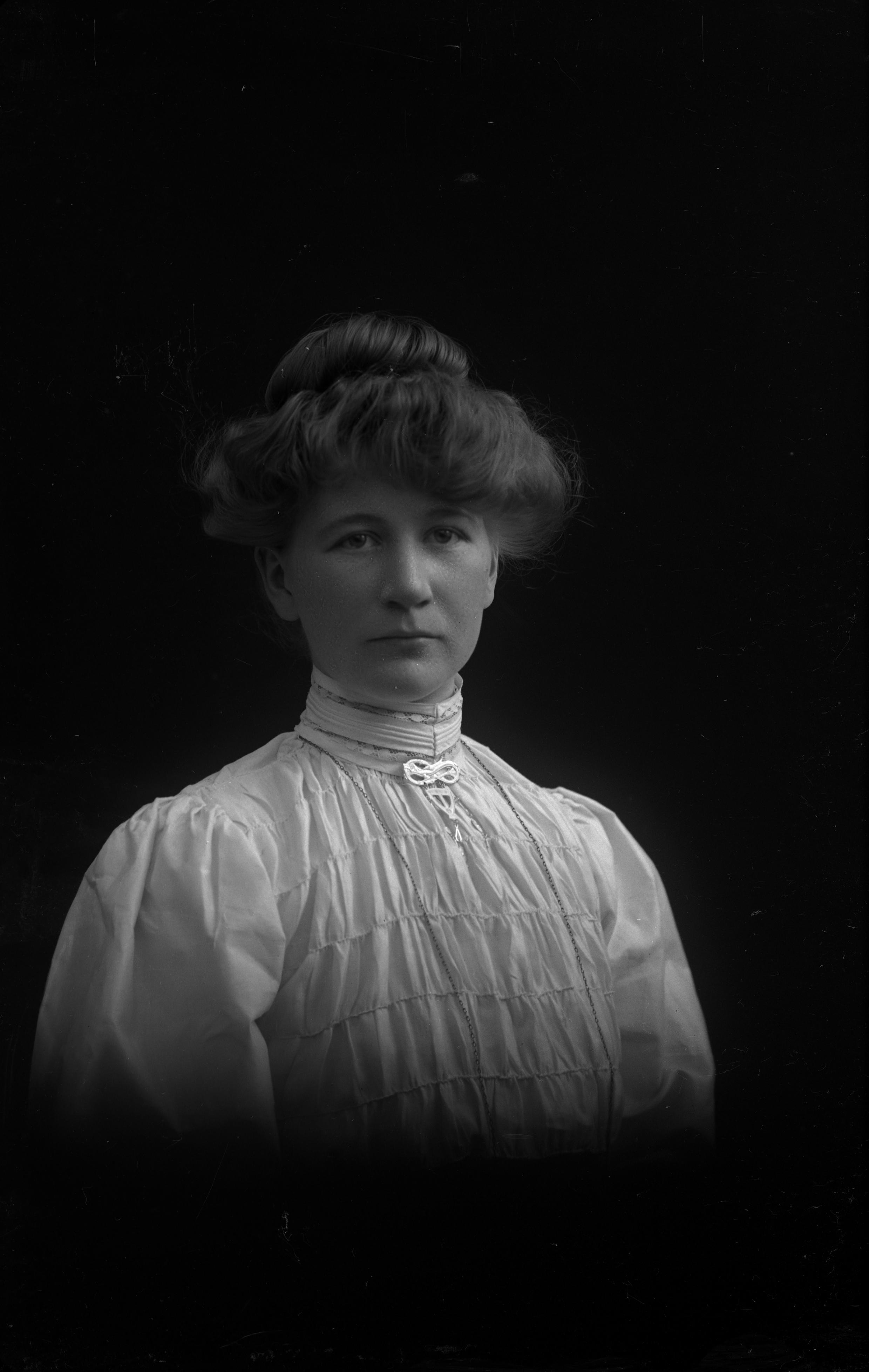 Porträtt i halvfigur av hotellpigan Hilda Ryd.