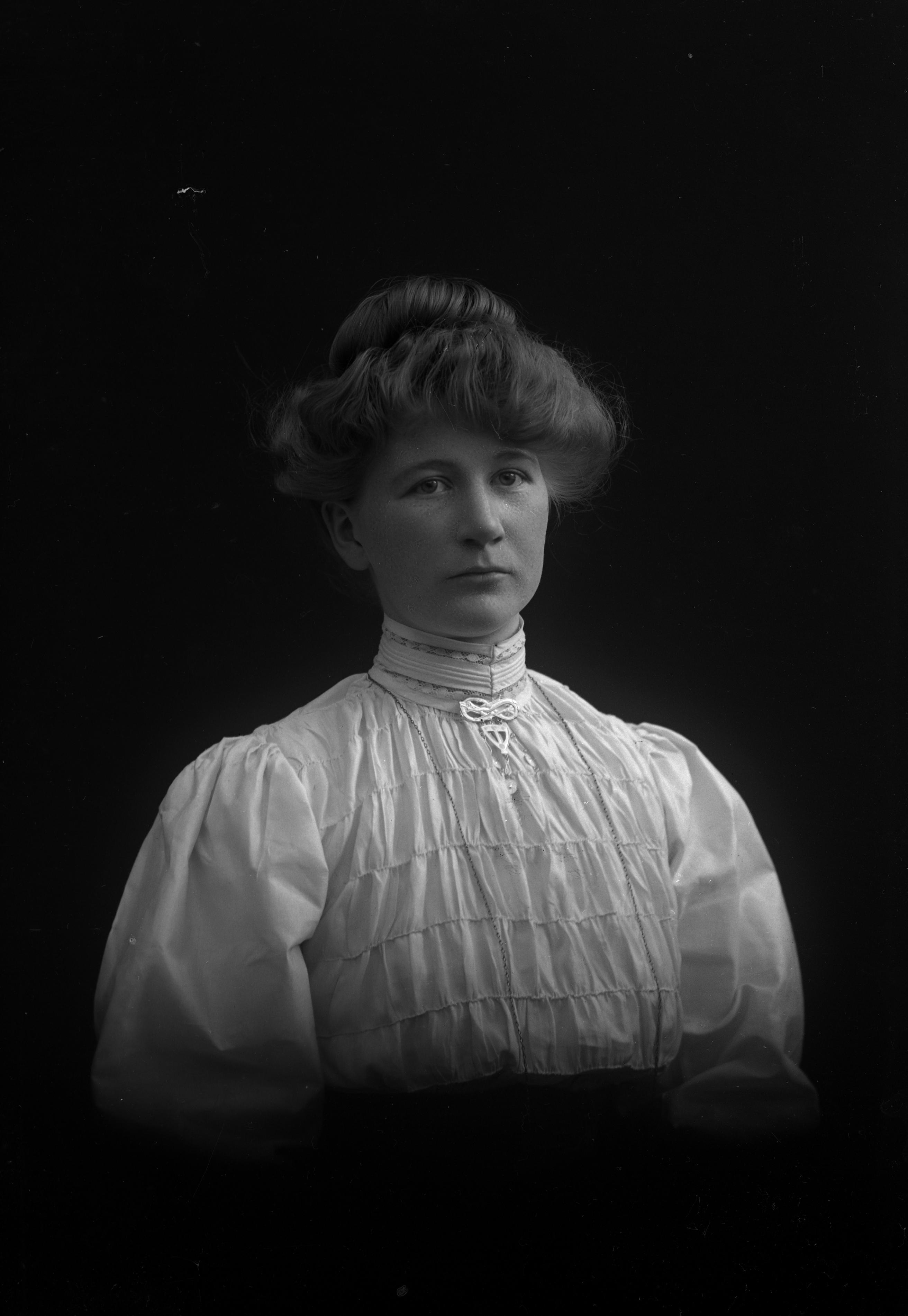 Porträtt i halvfigur av hotellpigan Hilda Ryd.